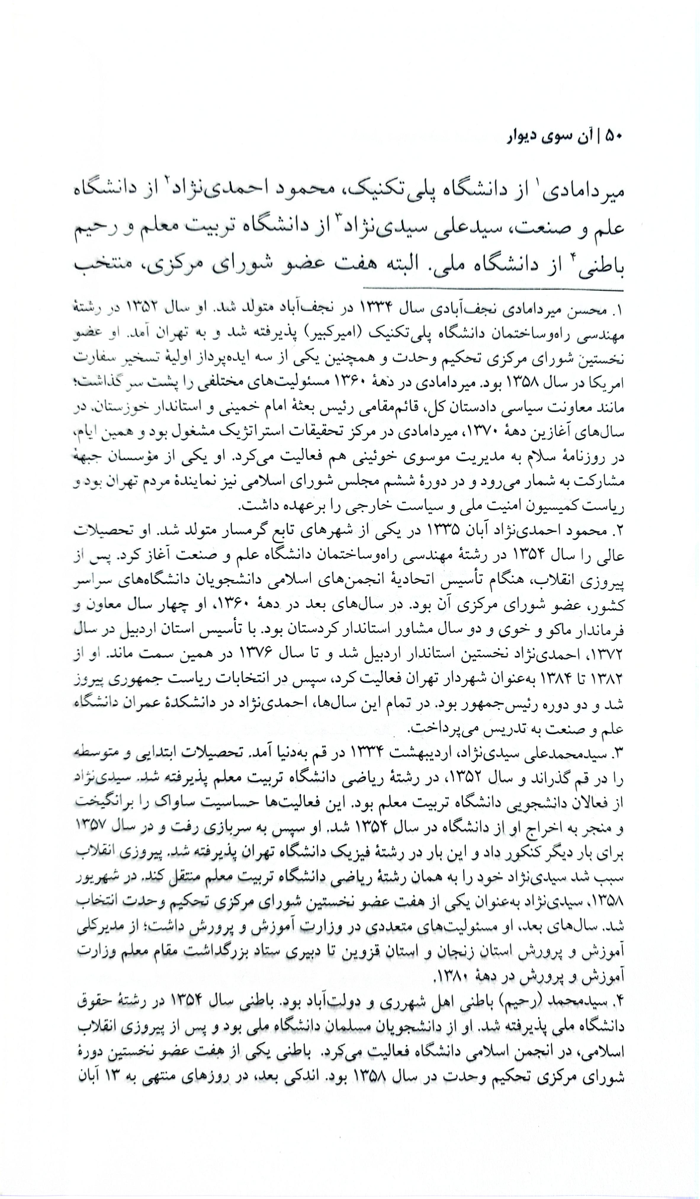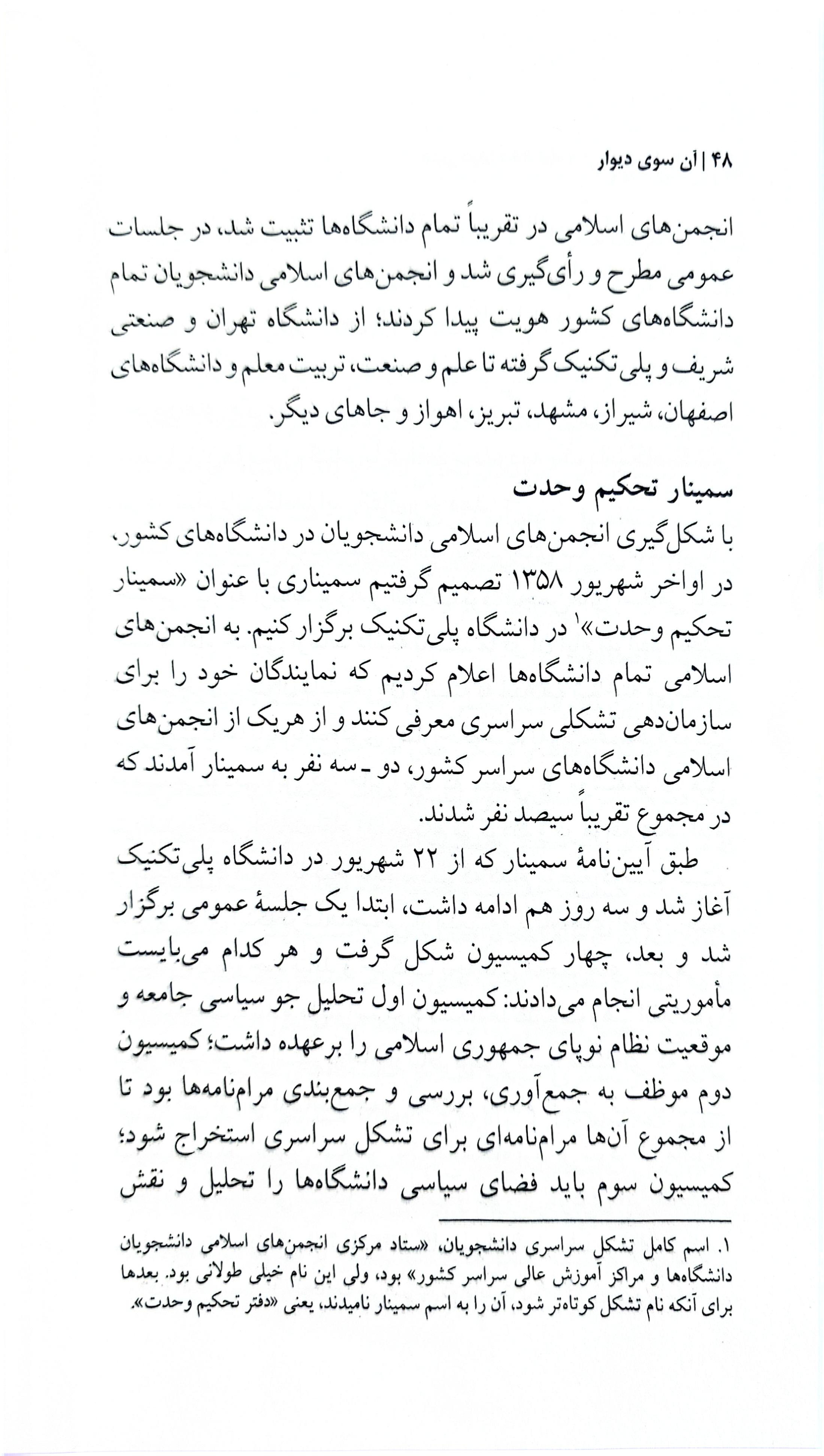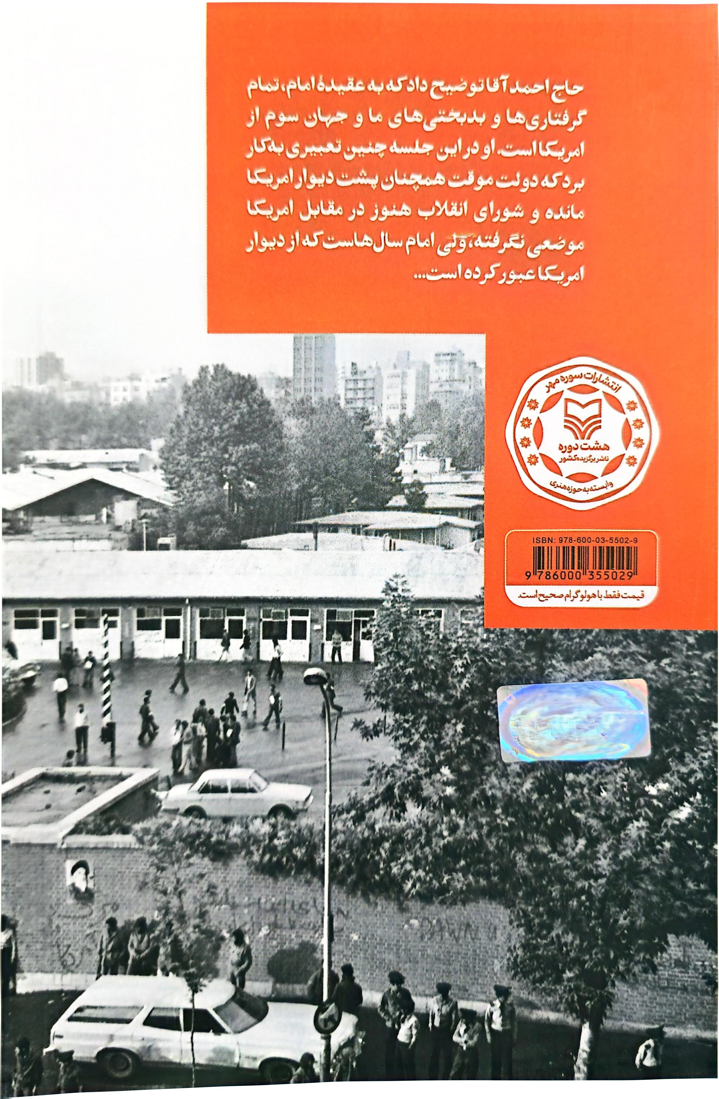 13 آبان سال 1358، درب ورودی سفارت آمریکا در تهران، حضور تعداد زیادی دانشجو و گروگانگیری سفیران آمریکا در ایران. این جریان با نام بحران گروگانگیری در رسانههای بیگانه بازتاب یافت. در ایران نیز از سوی دولت موقت تایید نشد. اما با پردهبرداری از اقدامات سفیران با نام تسخیر لانه جاسوسی در رسانههای خودی بازتاب یافت. این حرکت شجاعانه ضمن تایید از سوی قاطبه مردم ایران، توسط امام خمینی (ره)، انقلاب دوم نام گرفت و قطع همکاری سیاسی بین ایران و آمریکا را سبب شد. کتاب آن سوی دیوار این برهه حساس از تاریخ انقلاب را روایت میکند.