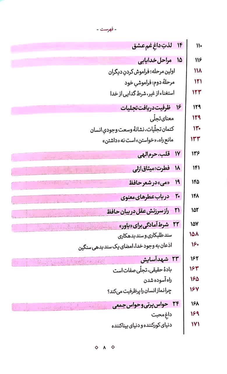 کتاب حاضر متن پیاده شده و تدوین شده سلسله جلساتی است که مرحوم استاد در دهه هشتاد در محل حافظیه شیراز به شرح برخی از ابیات جناب حافظ پرداختهاند. شرح ایشان نه صرفا تحلیلی ادبی، بلکه گشایشی روحانی و معرفتی به سوی دنیای پر رمز و راز حافظ است. موضوعاتی نظیر انسانشناسی، زبان حال اهل سلوک، جهانبینی خوشبینانه، عشق در کارگاه هستی، راه و رسم عاشقی، می در شعر حافظ، قلب و حرم الهی، چشم و روزنه روح و بسیاری از موضوعات دیگر دستمایه سخنان آیتالله حائری قرار گرفتهاند.