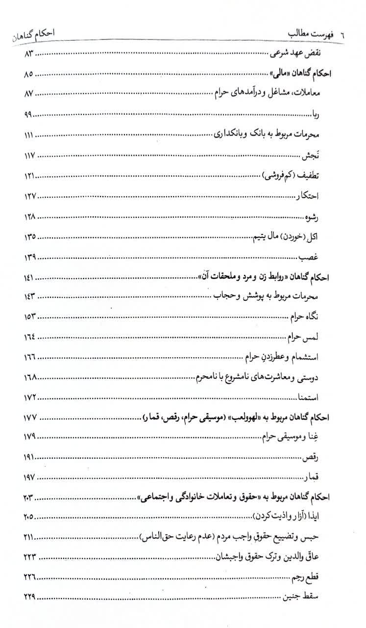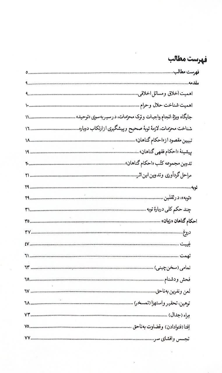 حال اولین قدم برای اتصال به اخلاق اسلامی دوری از گناه است. لذا کتاب به تفصیل این مساله را در زمینههای متنوع بررسی کرده است. نخست باب توبه را باز نموده تا با هر گناهی به سوی خدا بازگردیم. کتاب ضمن نیم نگاهی به این مفهوم در پرتوی قرآن و عترت به چند حکم کلی درباره آن اشاره میکند. پس از این احکام گناهان زبان از قبیل دروغ، غیبت، تهمت، استهزاء و ... بررسی میشوند. دیگر فصول کتاب به گناهان در زمینه مالی، روابط زن و مرد، موسیقی، رقص، قمار، تعاملات خانوادگی و اجتماعی، باورهای اعتقادی، خوردن و آشامیدن و دیگر زمینهها اشاره میکند تا مجموعه کاملی از احکام گناهان فراهم شود. این اثر در هر قسمت ضمن اشاره به آیات و روایات مرتبط به پرسش و پاسخهای مرتبط نیز پاسخ میدهد.