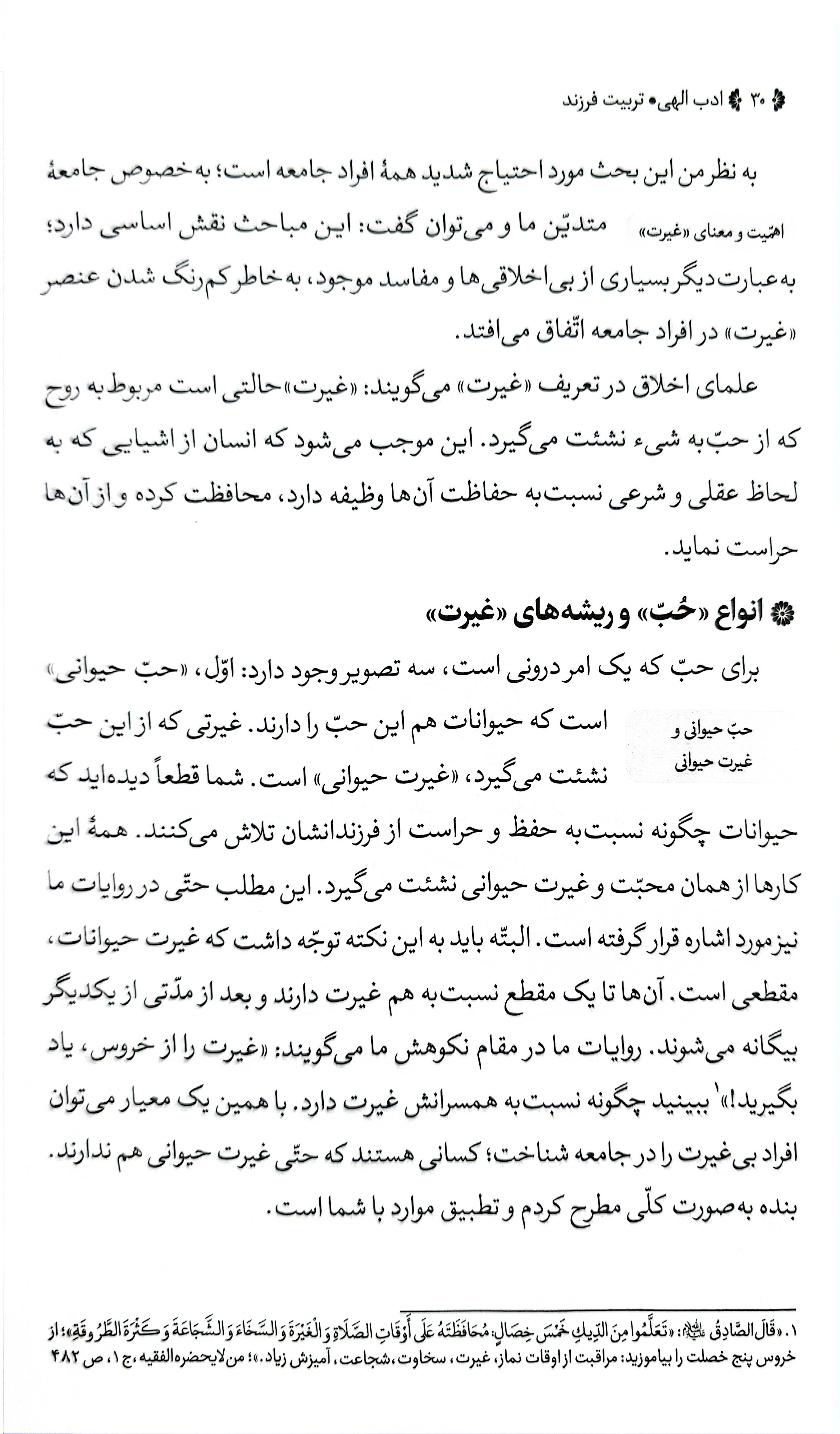 ((در تعریف غیرت گفته می شود: غیرت حالتی است مربوط به روح که از حبّ به شیء نشئت می گیرد و موجب می شود که انسان از اشیایی که به لحاظ عقلی و شرعی نسبت به حافظت آن ها وظیفه دارد، حفظ و حراست نماید...))