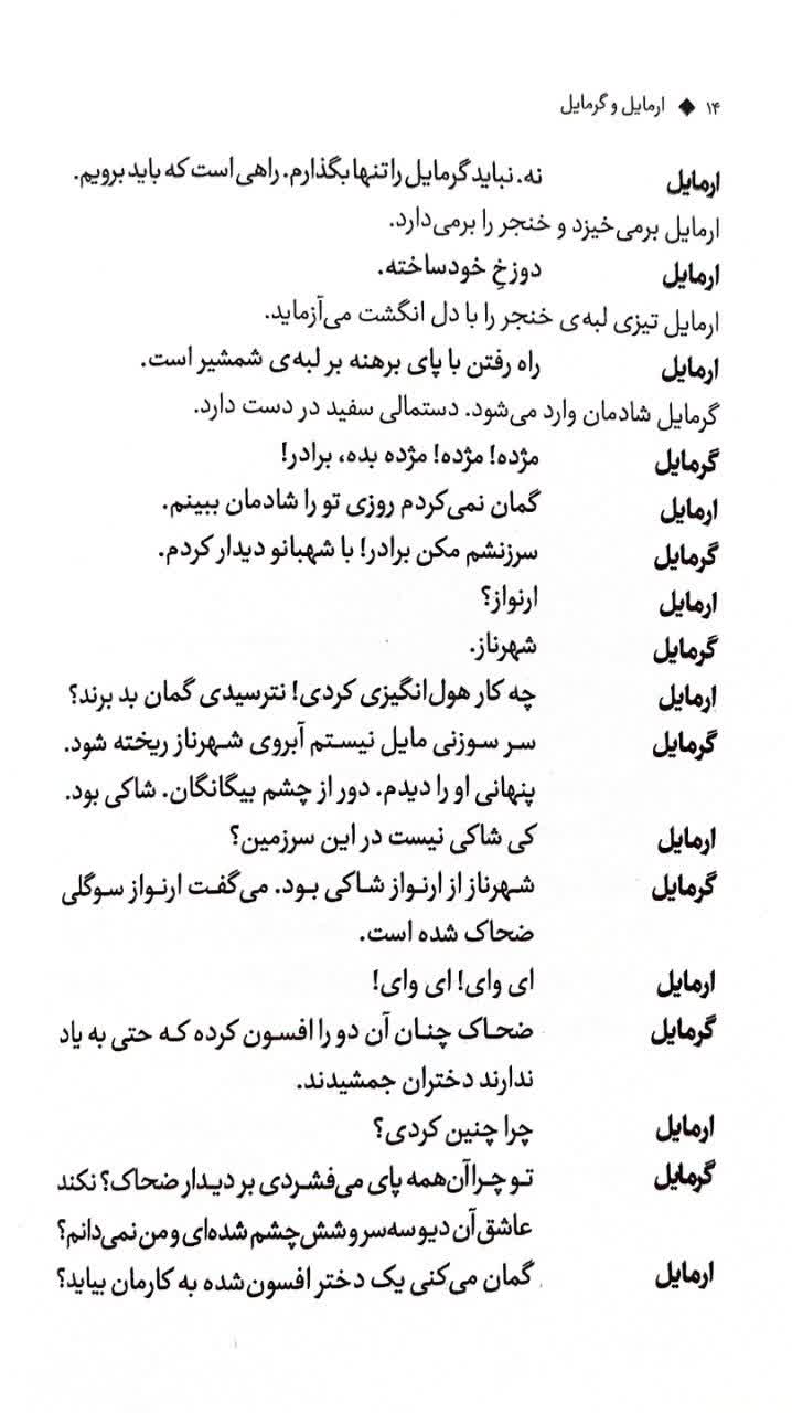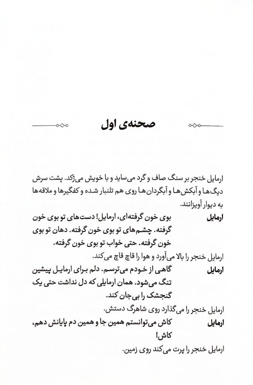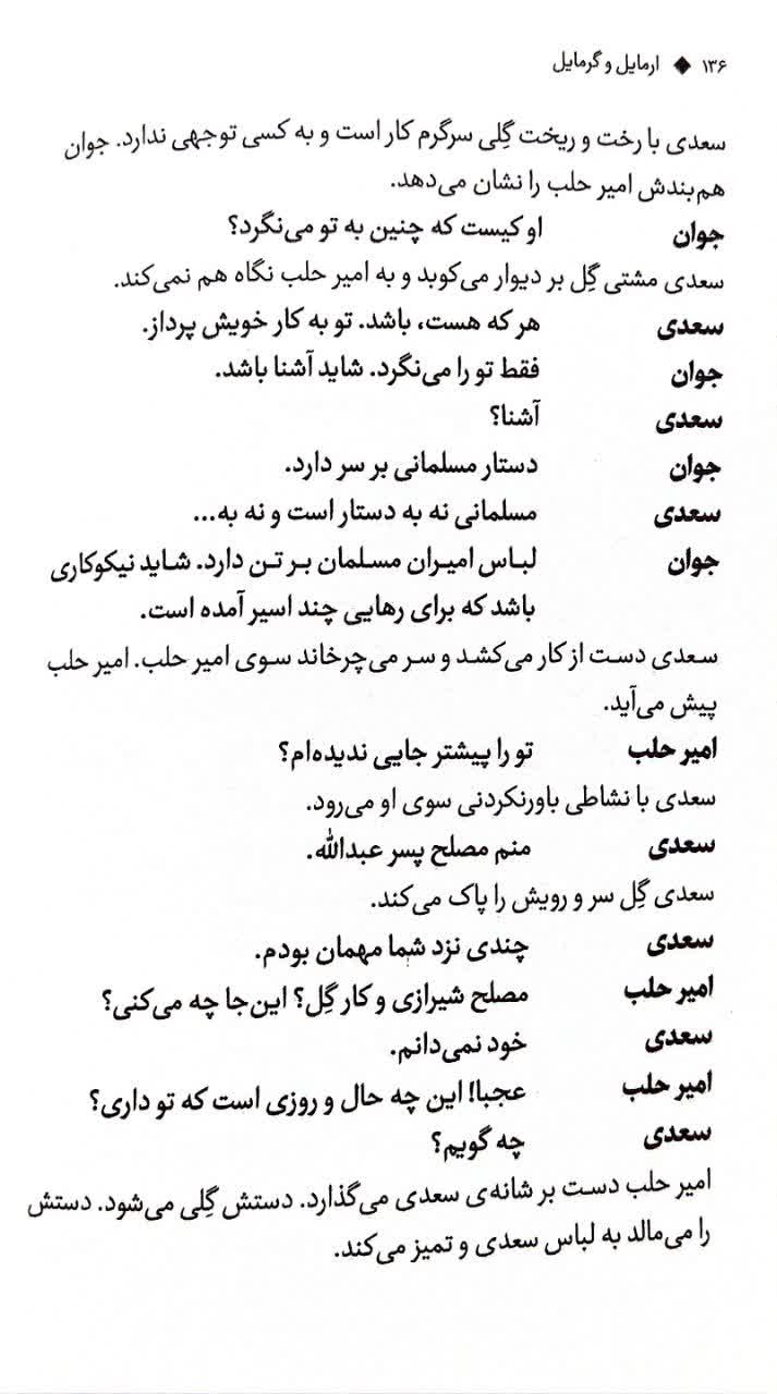اگه دختر امیر حلب خوش اخلاق بود و سعدی رو توی همون حلب نگه میداشت یه پایه ادبیات فارسی سر جاش نبود. خدا بیامرزدش فرض کنین اون زن بلد بود قورمه سبزی درست کنه و یه لبخند مکش مرگ ما هم کنج لبش مینشوند و دل سعدی رو میبرد خب؟ خب که چی؟ خب دیگه نه گلستان داشتیم و نه بوستان و نه اون همه غزل ناب. اصلا اگه اون نبود همین حکایت پندآموز رو نداشتیم. همین نمایشنامه رو هم نداشتیم.