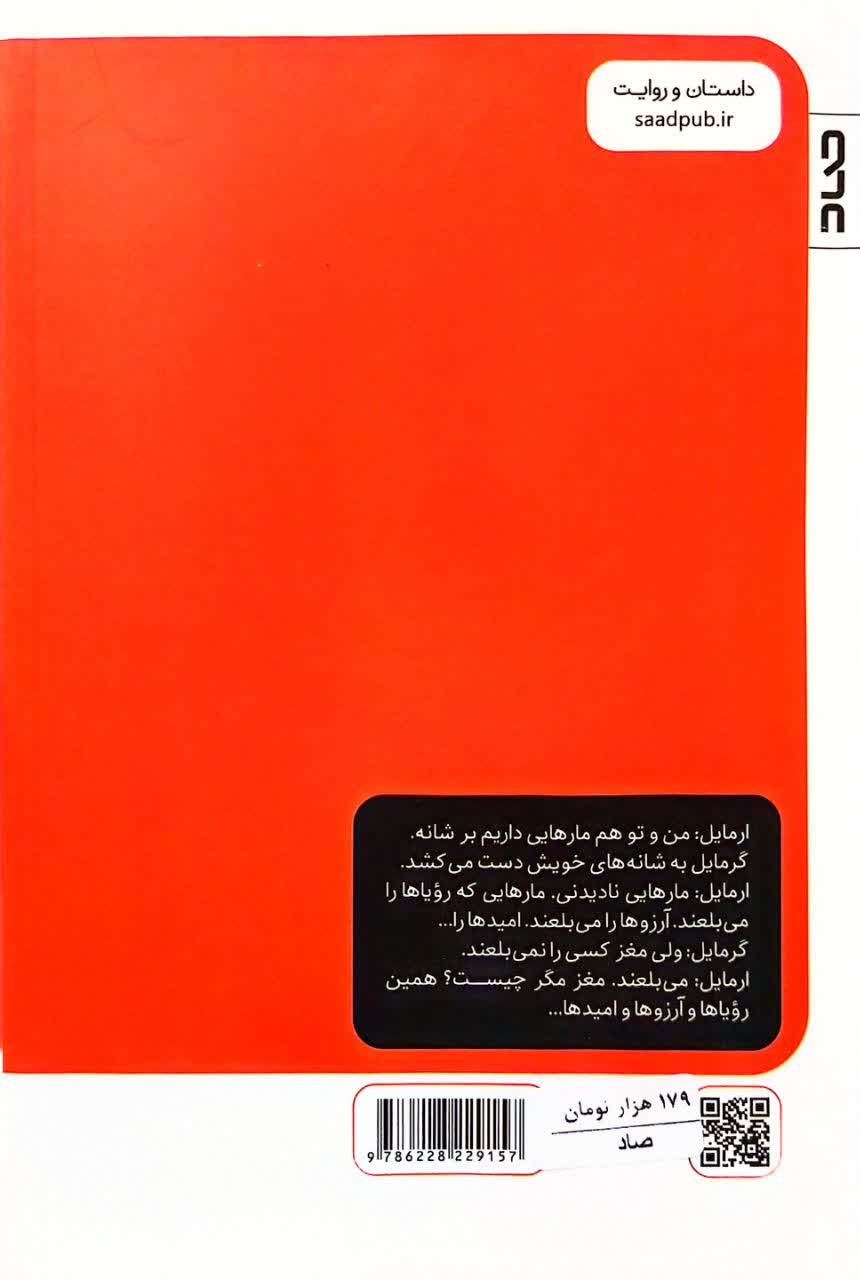 حسینعلی جعفری در این اثر با صحنهپردازیهای متفاوت و توصیف دقیق فضا و زمان به خوبی مخاطب را با خود همراه میسازد تا درک عمیقی از مفاهیمی چون قدرت، ترس، جوانمردی، رهایی و تعالی را بازنمایی کند. ارمایل و گرمایل دو آشپز ضحاک ماردوش هستند که هر روزه باید مغز چند جوان ایرانی را خوراک مارهای ضحاک کنند. بوی خون و قتل و سنگدلی دیگر در وجود آنها ریشه دوانده است. اما هنوز روزنههایی از مهربانی در دلشان سوسو میزند. آیا انها به قتل جوانان این سرزمین راضی میشوند یا چارهای دیگر برای آرام کردن مارهای ضحاک پیدا میکنند؟ آیا آنها حاضرند با نجات جان دیگران، جان خود را در معرض خطر قرار دهند؟