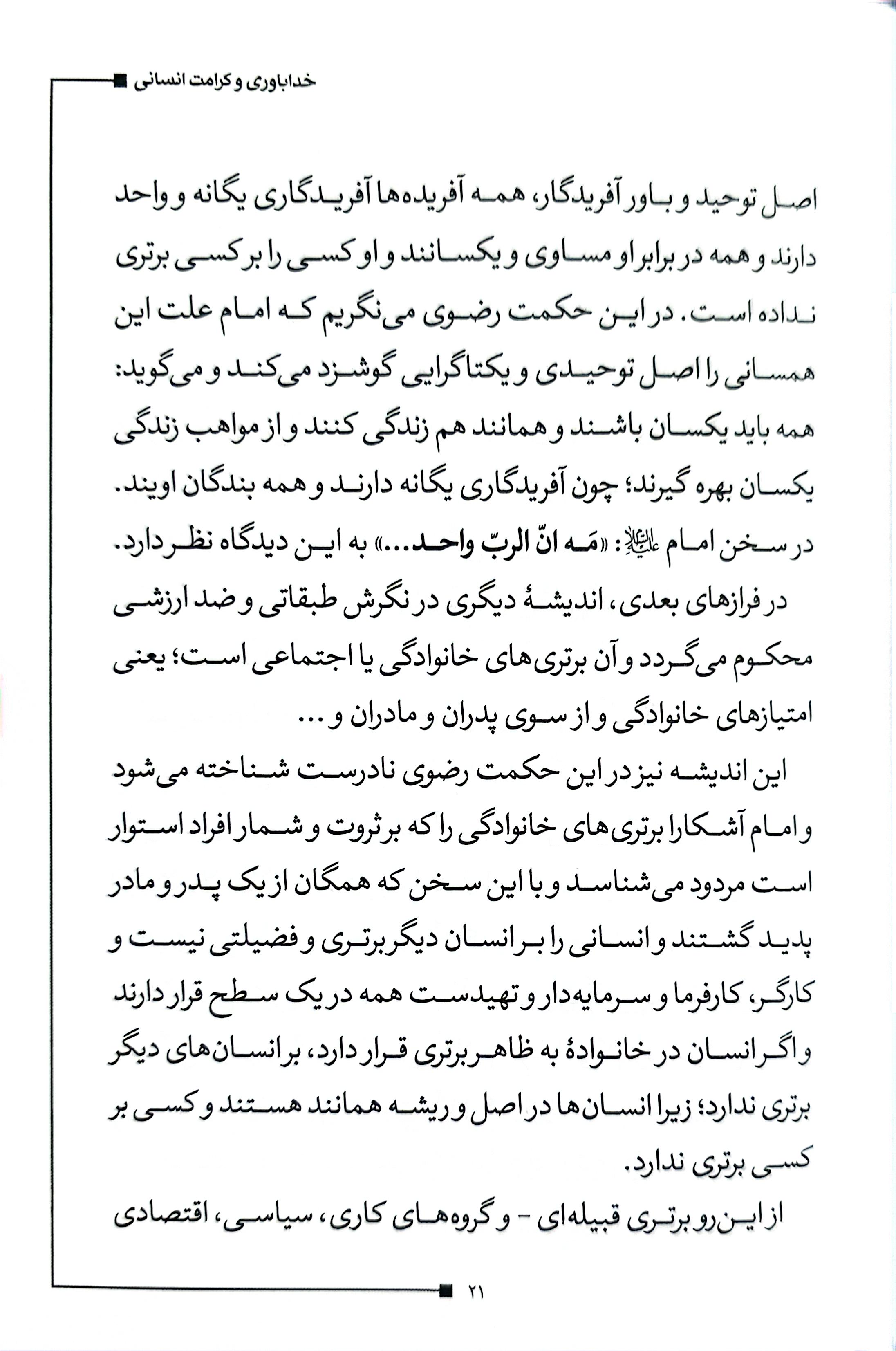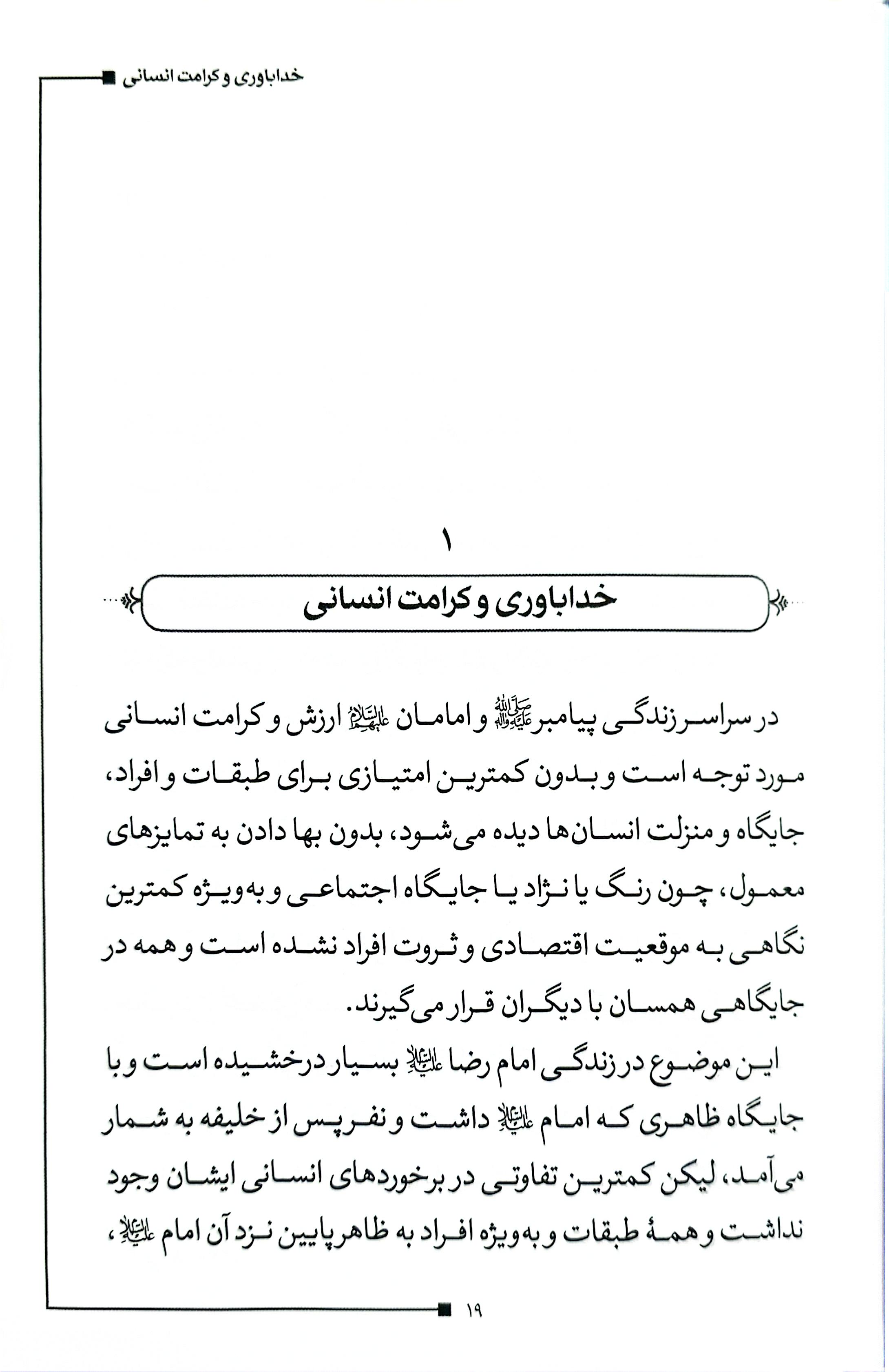 در سراسر زندگی پیامبر(ص)و امامان (ع) ارزش و کرامت انسانی مورد توجه است و بدون کمترین امتیازی برای طبقات و افراد ،جایگاه و منزلت انسانها دیده میشود،بدون بها دادن به تمایز های معمول،چون رنگ یا نژاد یا جایگاه اجتماعی و به ویژه کمترین نگاهی به موقعیت اقتصادی و ثروت افراد نشده است و همه در جایگاهی همسان با دیگران قرار می گیرند.در این کتاب به موضوعاتی از قبیل ؛خداباوری و کرامت انسانی ،حقوق برادری وکرامت انسانی ،کرامت انسانی در گفتارهای علمی،کرامت انسانی و اخلاق گروهی ،دولتمردان پاسدارکرامت انسانی و…پرداخته شده است.