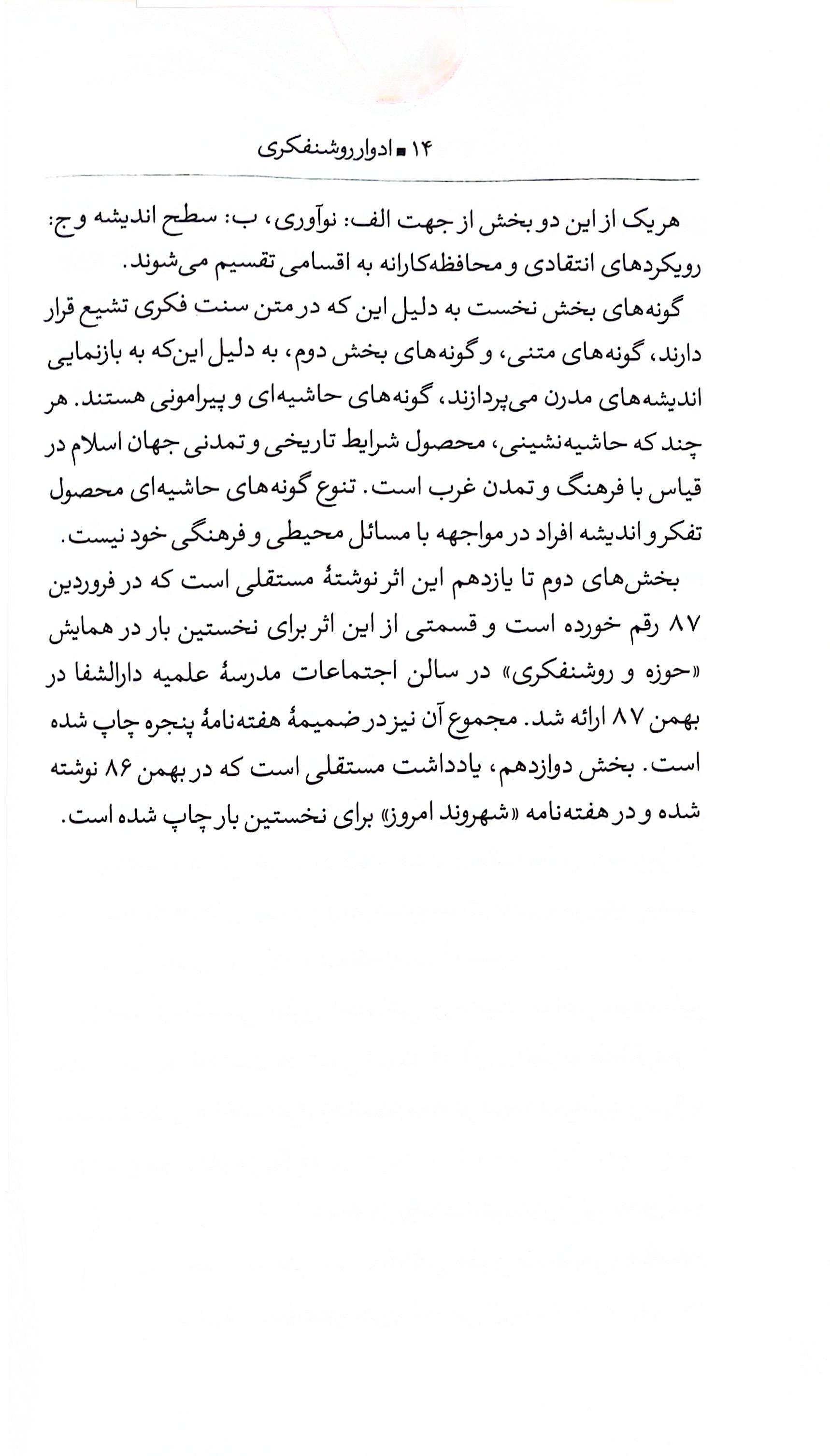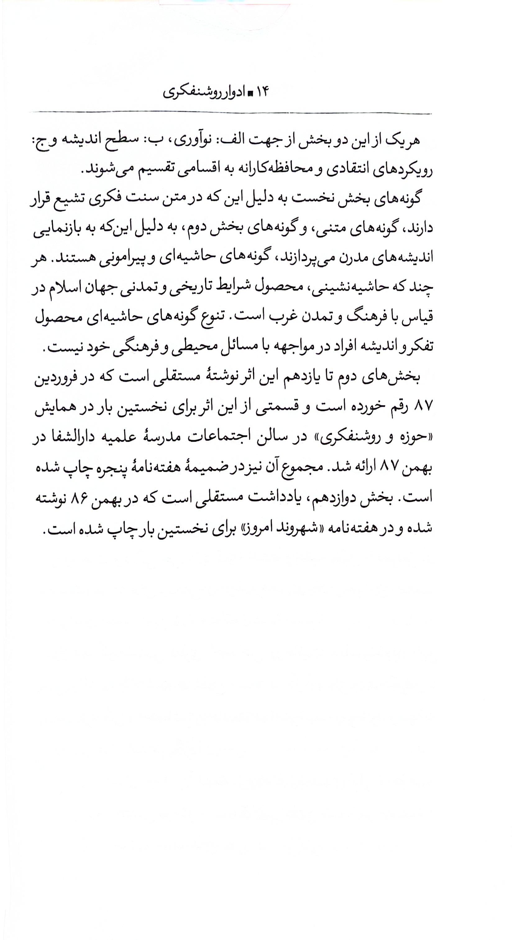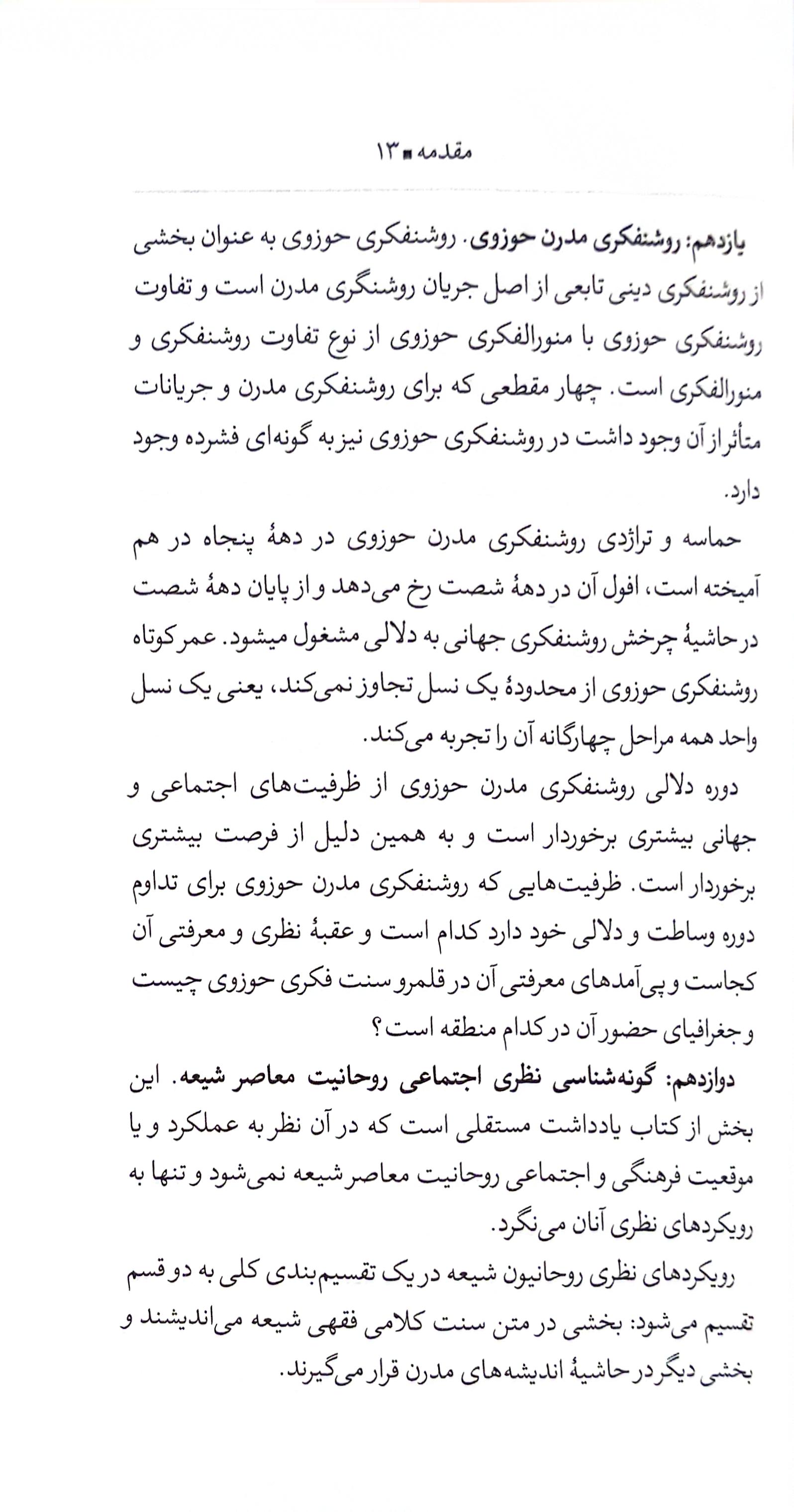 و اما حرفِ تازهی کتاب: تمرکز اصلی نویسنده روی یک ترکیب خاص است: «روشنفکری حوزوی». شاید بپرسید مگر میشود؟ پارسانیا با تکیه بر آن سابقهی طولانی و قویِ عقلانیت در شیعه، به این سوال جواب میدهد. او بررسی میکند که آیا اصلاً «روشنفکری» با «حوزوی بودن» جمع میشود؟ و اگر بله، در تاریخ معاصر ما چه شکلی بوده است؟