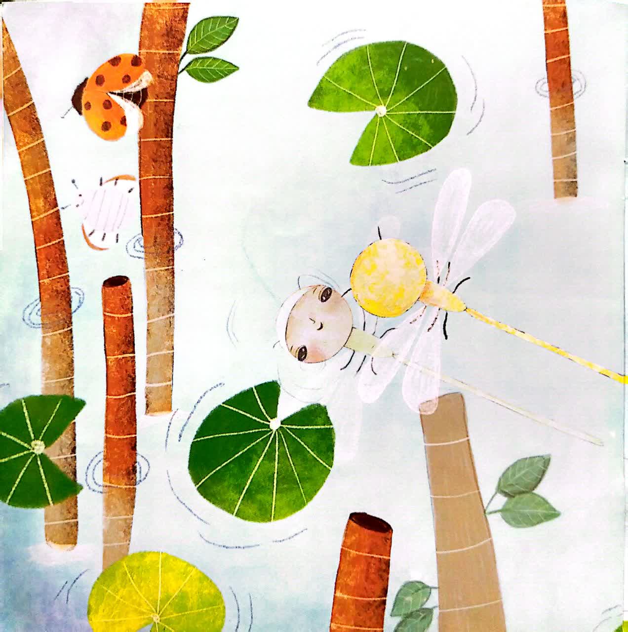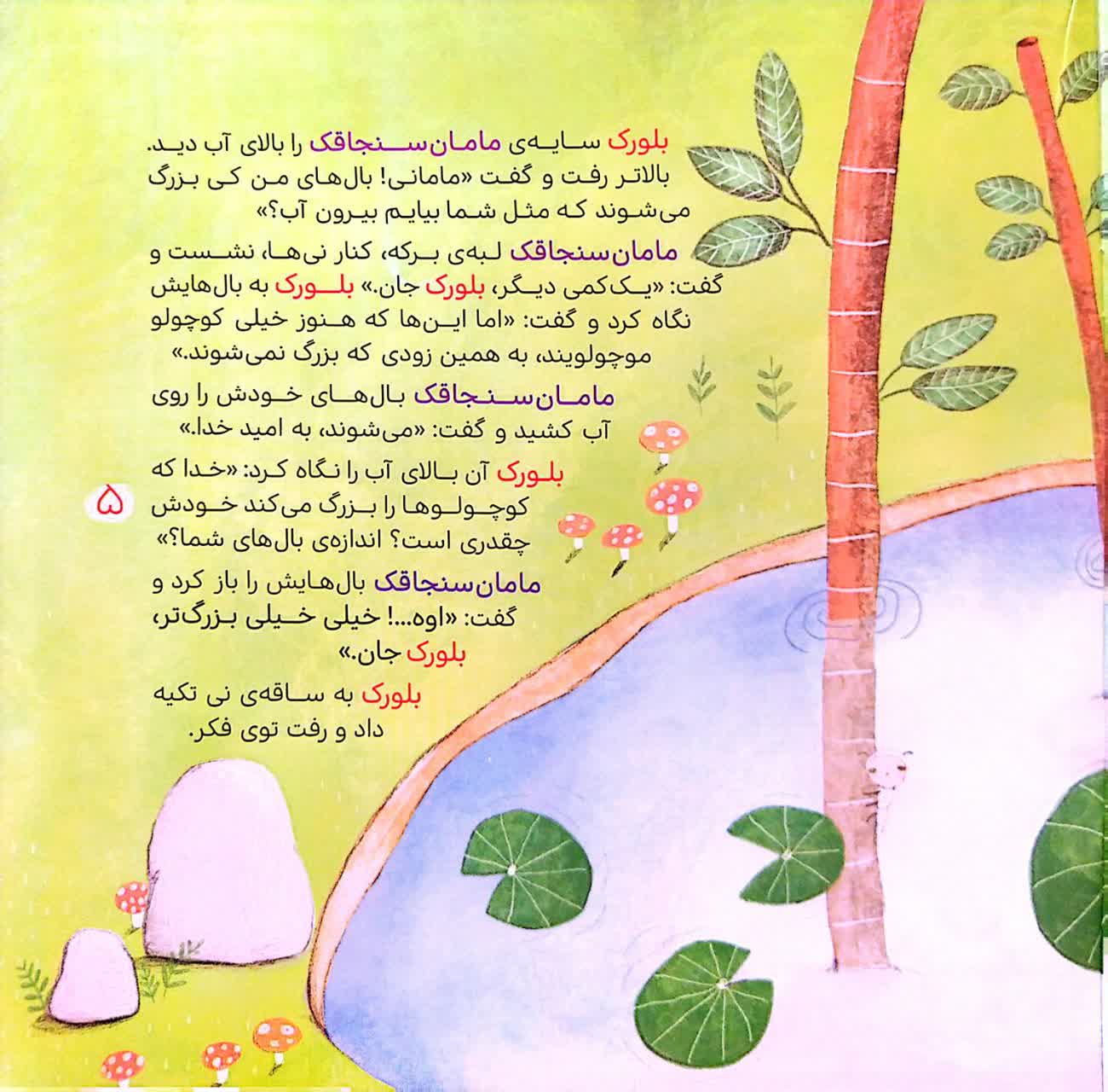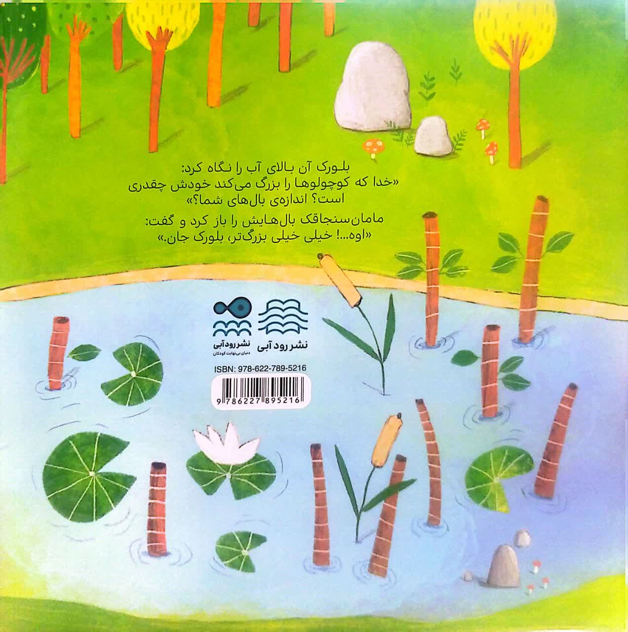 داستان از زبان بلورک، یعنی سنجاقک کوچواوی روی برکه، روایت میشود. بلورک که هنوز خیلی کوچک است از میخواد پرواز کنه. از مامان سنجاقک میپرسه: «بالهام کی بزرگ میشه که بتونم مثل شما پرواز کنم؟» مامان سنجاقک میگوید: «چند روز دیگر بلورک جان». و حالا بلورک خدا را به خاطر بالهای بزرگش شکر میکند.
