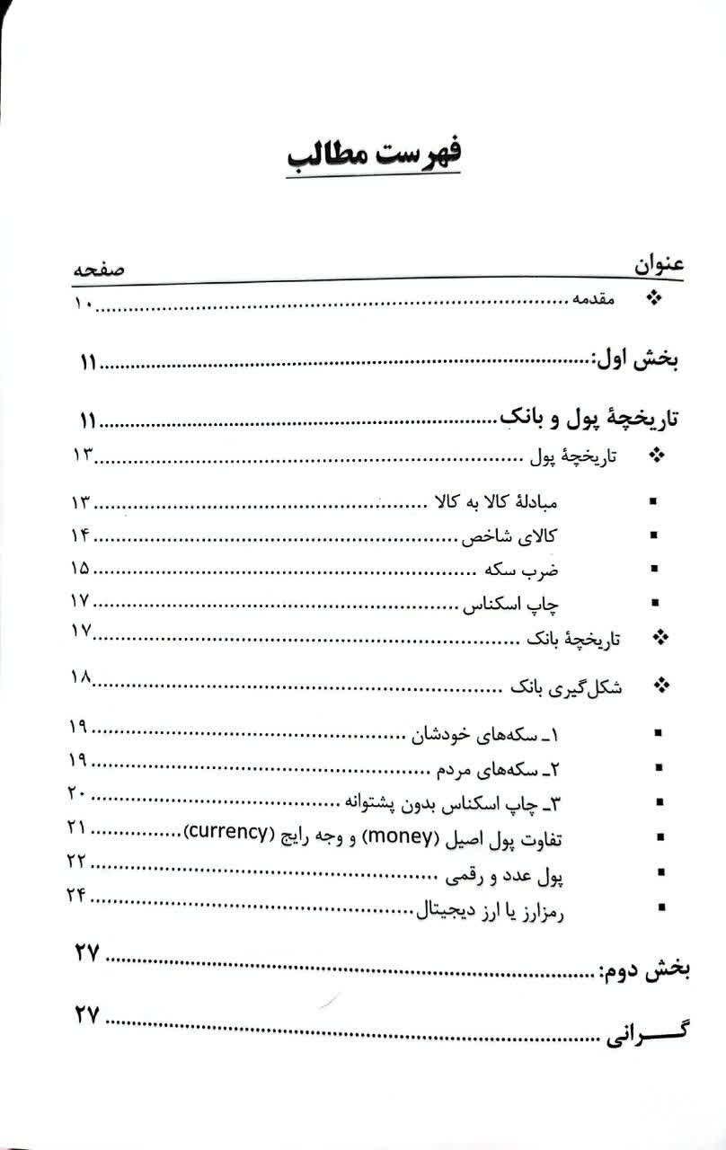 احمد روزی در بخش اول کتاب خود از تاریخچه پول میگوید. مبادله کالا به کالا، کالای شاخص، ضرب سکه و چاپ اسکناس چهار مرحله رایج در گذار پول میباشد. بعد از این تاریخچه بانک از شکلگیری تا رمزارز واکاوی میشوند.