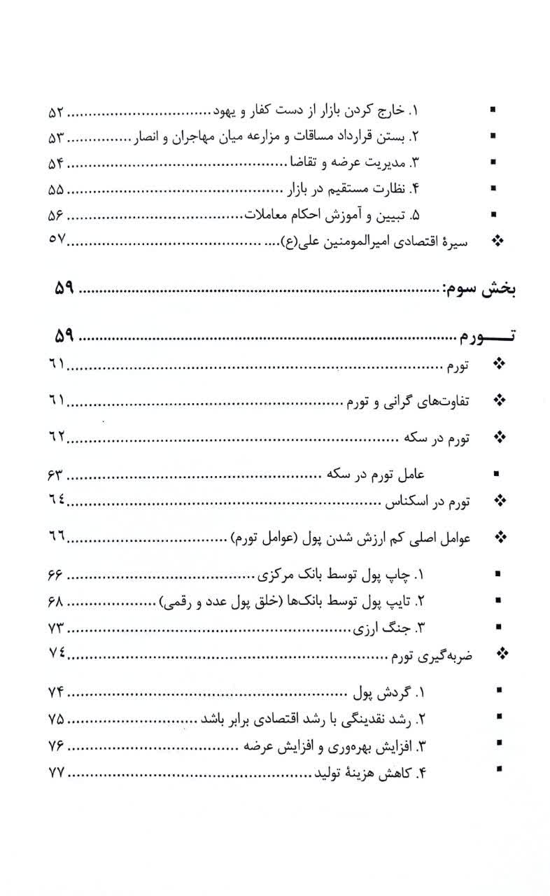 بخش دوم کتاب به مقوله آشنای گرانی میرسد. این بخش از چهار قسمت تشکیل شده است. نظام توزیع کالا، عوامل گرانی، اقدامات اقتصادی پیامبر (ص) و سیره اقتصادی امیرالمومنین (ع) اهم مطالب این بخش را تشکیل دادهاند.