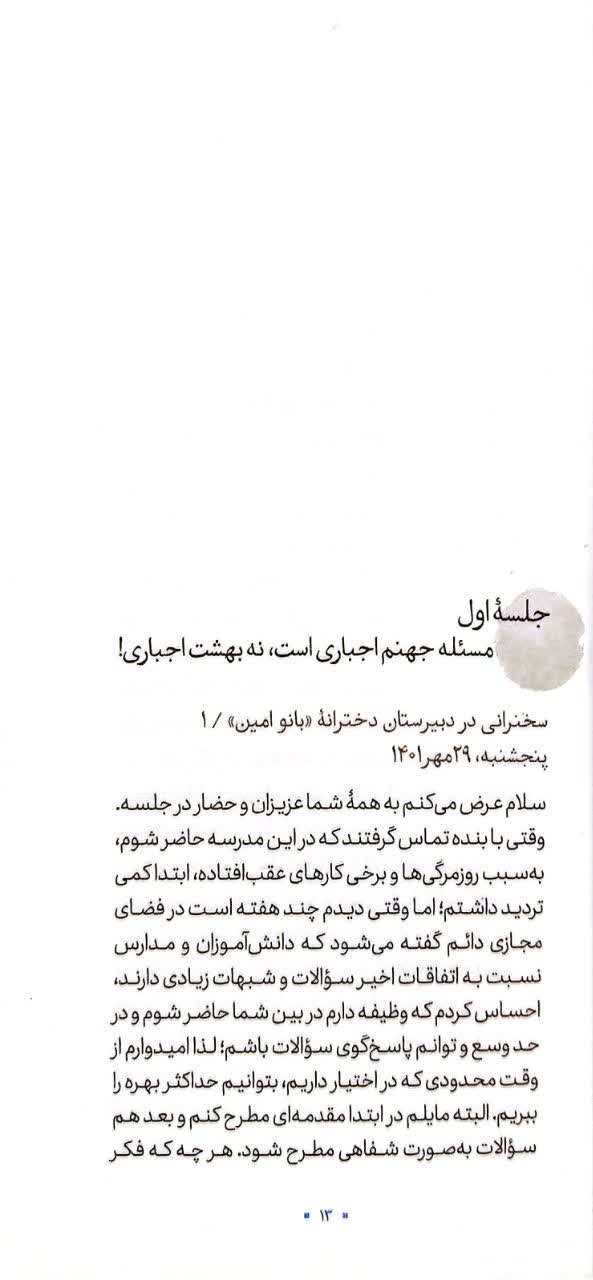 «امیرحسین ثابتی» مجری برنامه جهانآرا در شبکه افق، در گیرودار همین اتفاقات و در بحبوحه دنبال کردن اخبار داخلی و خارجی بود که از طرف یکی از مدارس دخترانه کشور دعوت به سخنرانی شد. او این مسئله را یک فرصت دید تا با نسل نوجوان، که در وقایع اخیر توسط برخی از رسانهها پررنگتر شده و عامل اصلی اعتراضات معرفی شدند، دیدار و گفتگویی داشته باشد. این کتاب حاصل پرسش و پاسخهای دانشآموزان دهه هشتادی از شش دبیرستان دخترانه مختلف با امیرحسین ثابتی است؛ سوالهایی که نویسنده از مخاطبانش خواسته بدون خودسانسوری و ترس مطرح کنند تا درمورد آن به بحث بپردازند. در بین این سوالها مسائلی مانند «حجاب، دین، آزادی، عدالت، وطنپرستی، توطئه، خانواده و ایدئولوژی» مطرح میشوند و در خلال پاسخ دادن به این مسئلهها، نویسنده فهمیده که این نسل، نسل متفاوت و عجیبی نیست؛ بلکه تبلیغات غربیها باعث شده این باور در بین مردم رایج شود و با ایجاد شکاف بین آنها و نسلهای قبلی، کمتر و کمتر مکالمه موثر با آنها شکل گرفته است.