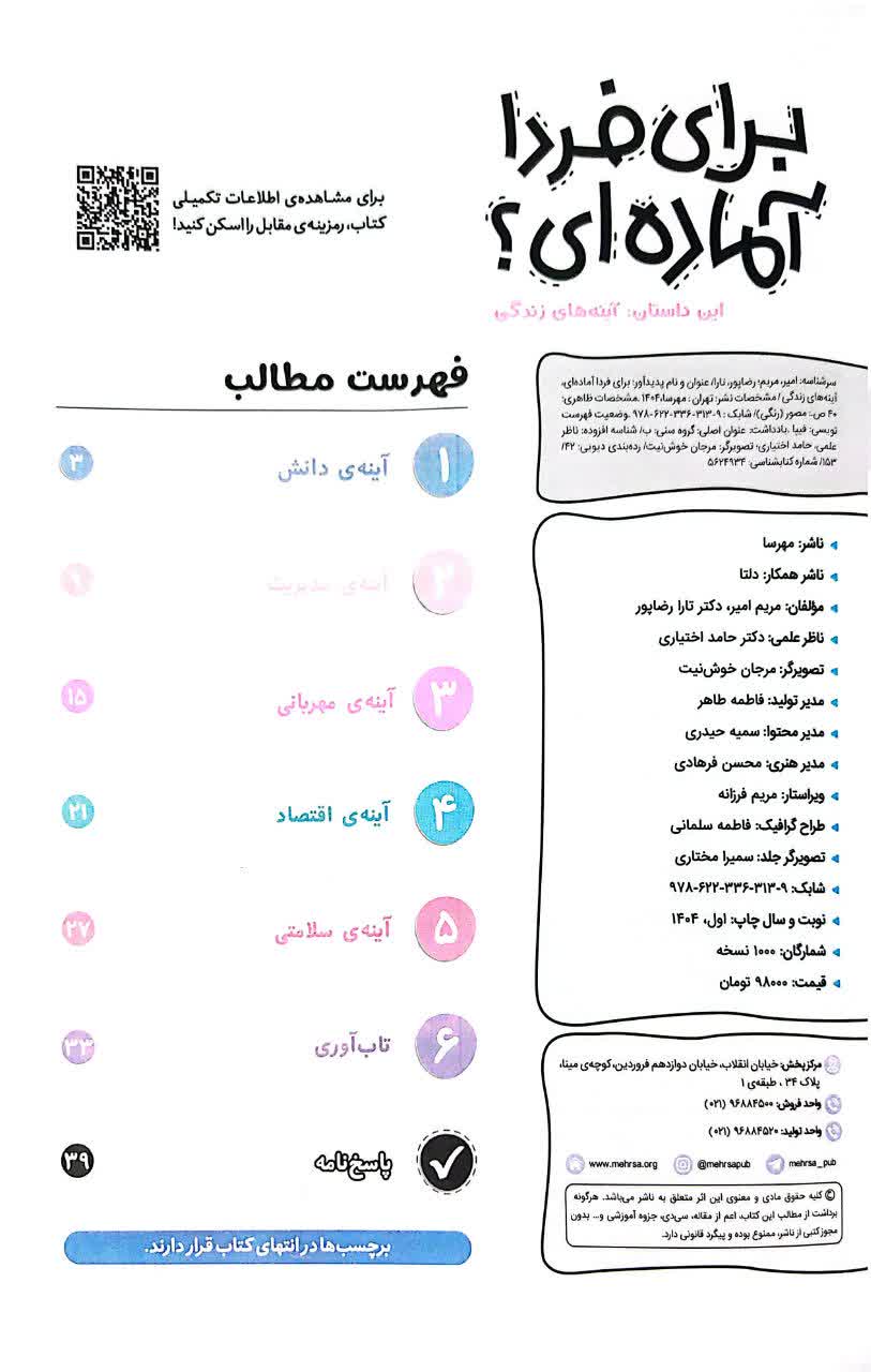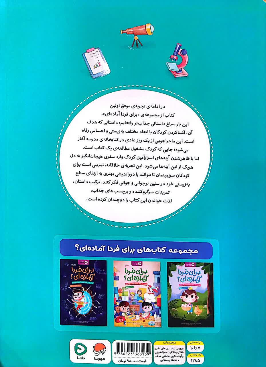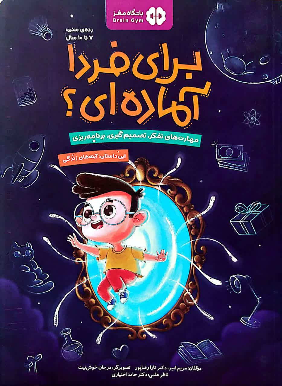 کتاب برای فردا آمادهای اثری از مجموعه باشگاه مغز است که مهارتهای تفکر، تصمیمگیری و برنامهریزی را به کودکان 7 تا 10 ساله آموزش میدهد. مریم امیر و دکتر تارا رضاپور ماجراجویی کوچک را به درون آینه میفرستند. دنیای درون آینه بسیار شگفتانگیز است و مخاطب عزیز کتاب باید به این ماجراجو کوچک یاری برساند. هر تمرین ضمن آشنایی کودک با دنیای پیرامونش او را به سمت یک انتخاب پیش میبرد تا ضمن تحلیل مشکل ایجاد شده بهترین انتخاب را انجام دهد. تصویرگری جذاب و رنگی کتاب در کنار برچسبها حس و حال خوبی به کودکان میدهد تا تمارین کتاب را با علاقه بیشتری انجام دهند.