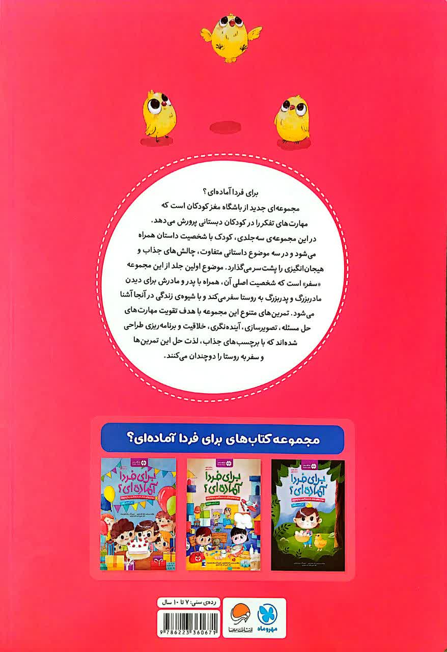 کتاب برای فردا آمادهای اثری از مجموعه باشگاه مغز است که مهارتهای تفکر، تصمیمگیری و برنامهریزی را به کودکان 7 تا 10 ساله آموزش میدهد. مریم امیر و دکتر تارا رضاپور در این جلد از مجموعه برای فردا آمادهای کودکان همراه با قهرمان داستان به روستا سفر میکنند. کودکان در سفری خانوادگی با پدر و مادر و پدربزرگ و مادربزرگ خود سفر آغاز میکنند. این سفر علاوه بر آشنایی کودکان با روستا و دنیای پیرامونشان آنها را درگیر مسئله و هنر حل مسئله میکند تا مهارتهای تصویرسازی، آیندهنگری، برنامهریزی را به آنها آموزش دهد و خلاقیت آنها را تقویت کند. ترکیب داستان با تصاویر زیبا، برچسب و تمرین، طعم دلنشینی به مخاطب القا میکند که او را تا انتهای داستان پیش میبرد.