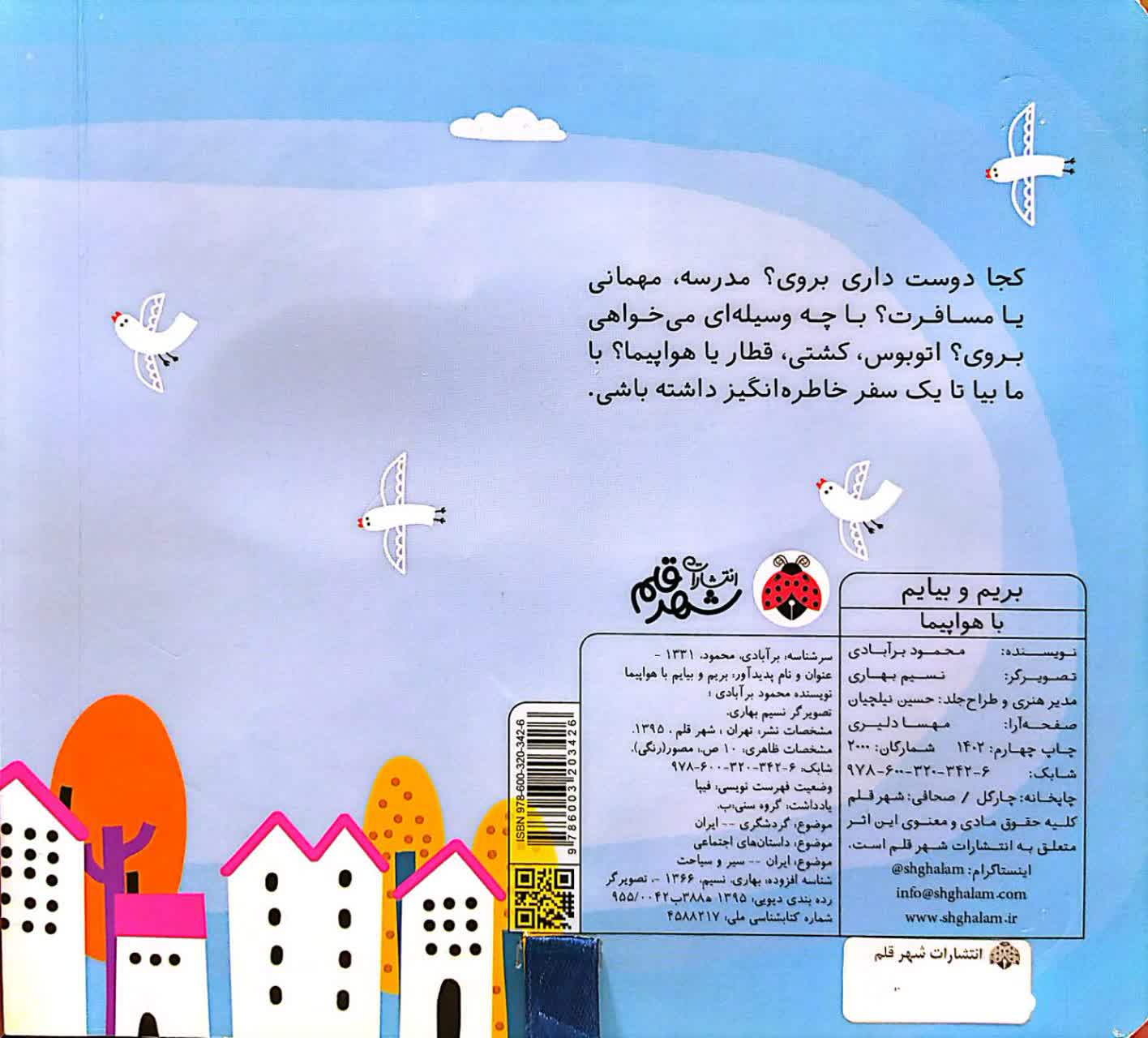 شما دوست دارید برین سفر؟ با چه وسیلهای؟ ماشین، قطار، اتوبوس، یا کشتی؟ این بار در کتاب بریم و بیایم قراره سوار بر هواپیما از یک صفحه به صفحه دیگر سفر کنیم، یعنی واقعا باید هواپیما رو جا به جا کنید، خاطرات سفر هوایی رو ورق بزنید و با تصاویر جذاب کتاب با دنیای پیرامونمان بیشتر آشنا شویم. راستی صفحات این کتاب گالینگور هستند تا توسط کودک پاره نشوند و بمانند به یادگار.