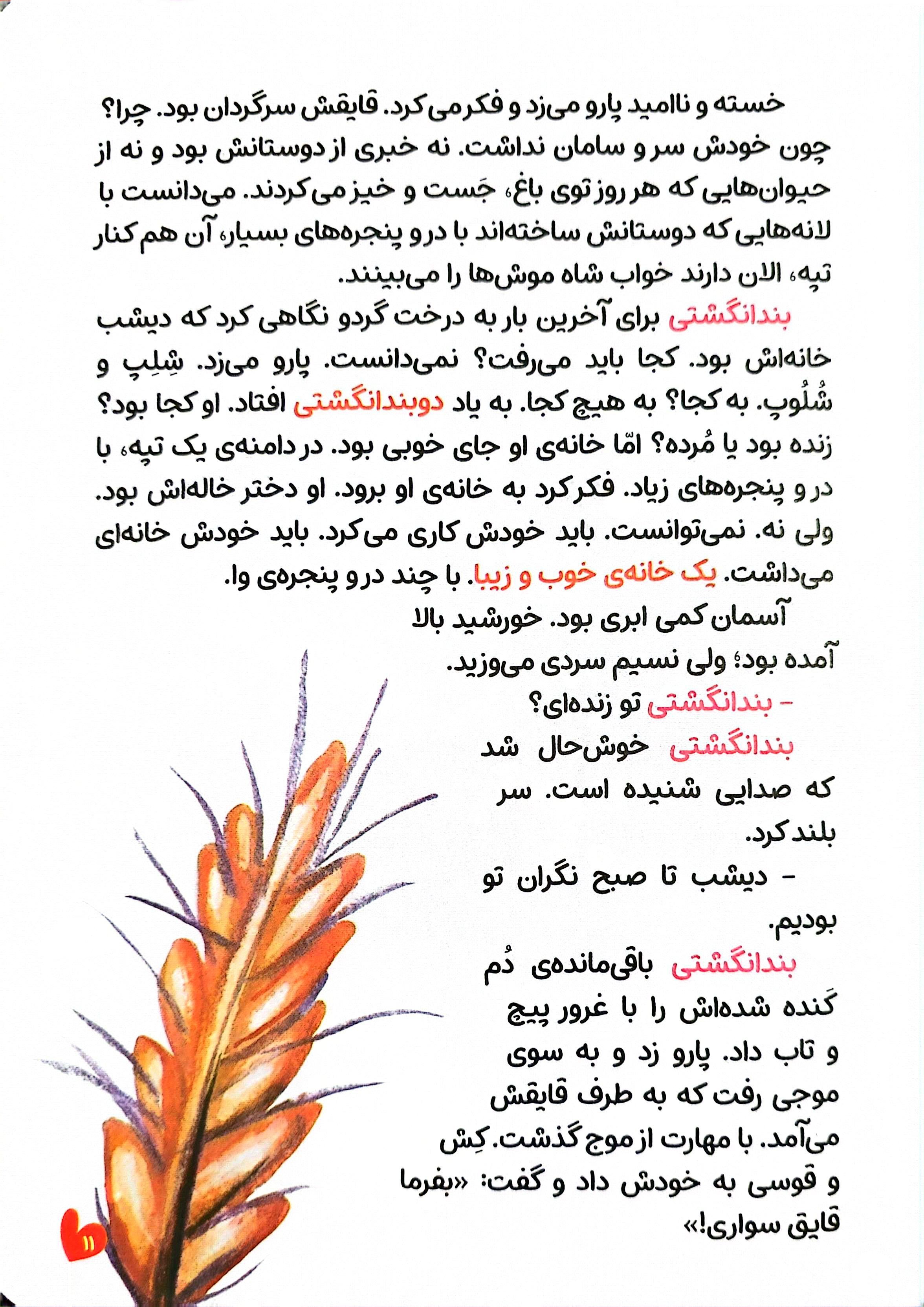 بندانگشتی به سوی صحرا دوید و مار به دنبالش میخزید. مار تصمیم گرفته بود هر طور شده بندانگشتی را شکار کند. یهو از میان نیها بیرون آمدند. بیخبر از آسمان؛ جایی که آن بالا بالاها عقاب میچرخید. همان پرندهای که وقتی پایین میآمد، بالهایش صدای وحشتناکی داشت. همان پرندهای که روز اول خواسته بود بندانگشتی را شکار کند؛ اما خرگوشی را برده بود. عقاب در آسمان میچرخید و مار و بندانگشتی را میدید و به آن دو میخندید.