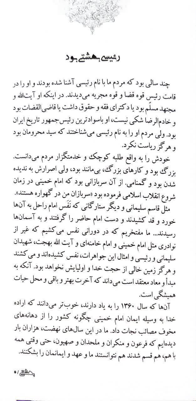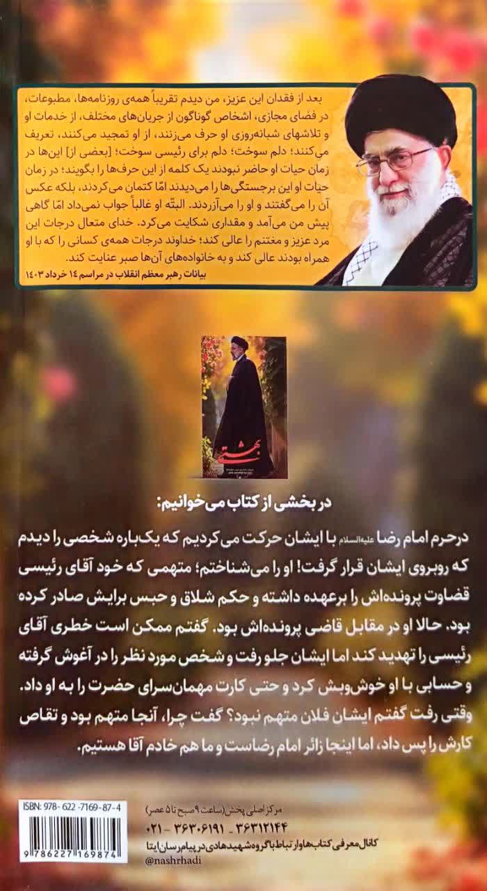 «دلم برای رئیسی سوخت»؛ ما هم دلمان برای رئیسی سوخت. دلمان برای خودمان هم سوخت که چرا مرد خستگیناپذیر جمهور به شهید جمهور بدل شد. نماند تا روزگارمان به سامان رسد و حالمان به شود و چرخ صنعت به رونق رسد و ... . کتاب بهشتی مجموعهای از خاطرات و برشهایی از زندگی این شهید بزرگوار است. کودکی، دوران تحصیل، روزگار تربیت در مکتب شهید بهشتی، دوران خدمت در کسوت رئیس جمهور و دوران تصدیگری در حرم مطهر امام رضا (ع)، ایستگاههای مختلفی هستند که در کتاب روایت شدهاند.