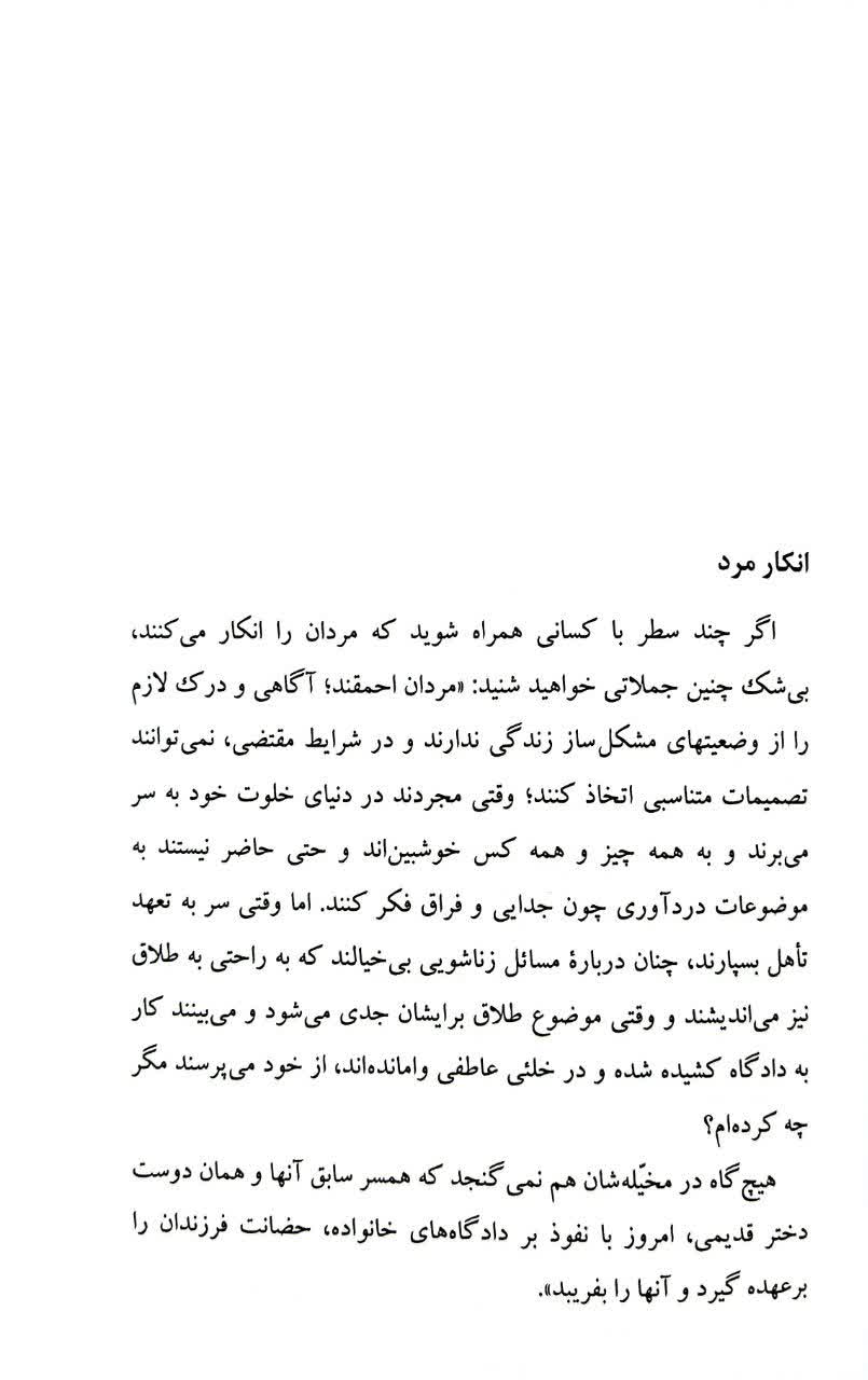 کتاب حاضر ضمن مرور بر جامعه غرب و غربشناسی در فصل نخست خود به مساله انکار مرد میپردازد. این شاید نخستین تاثیر فمینیسم بر افراد پیرامون زن باشد. فصل دوم کتاب با عنوان اهمیت پدر تاییدی بر فصل نخست است که نشاندهنده عواقب منفی فمینیسمگرایی است.