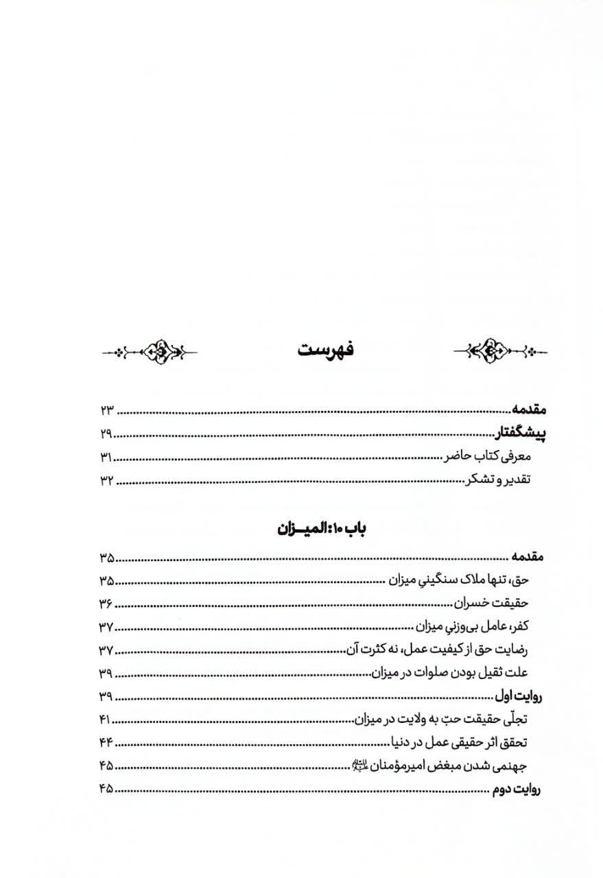 جلد یازدهم این مجموعه از پنج باب تشکیل شدهاست که منطبق بر ابواب ده تا پانزده کتاب المعاد میباشند. نخستین باب با عنوان میزان حق را تنها ملاک سنگینی میزان میداند و نشان میدهد رضایت حق از کیفیت عمل است و نه کمیت آن. کتاب در پرتوی روایات متعدد نشان میدهد سنگینترین عمل نیک در ترازوی عمل انسان صلوات بر محمد و آل محمد (ص) است. سپس جایگاه حسن خلق و ولایت امیرالمومنین (ع) در جایگاه میزان مورد واکاوی قرار میگیرد. این باب با جدال بر سر کلمات «موازین» و «شهید» در قرآن خاتمه مییابد.