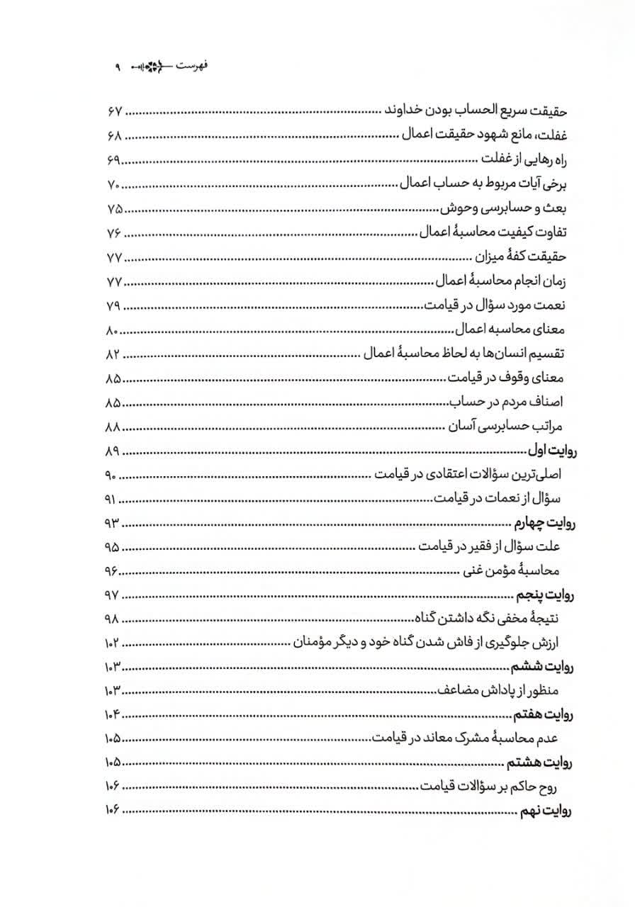 باب دوم کتاب مشتمل بر تشریح چهل و پنج روایت است. این باب با تفسیر عبارت «سریعالحساب» آغاز میشود و موضوعات متنوعی چون محاسبه مومن غنی، مقصود از پاداش مضاعف، نعمت مورد سوال در قیامت، دستگیری اهل بیت در حساب، عظمت گناه شرک، سوال از نعمت ولایت و ... را از نظر میگذراند.