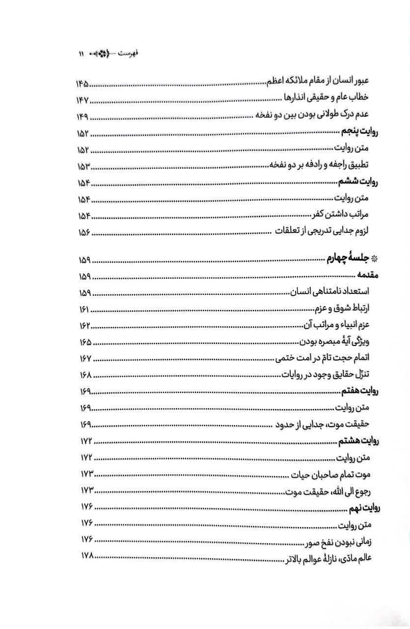 مقدمه این اثر ضمن معرفی کتبی پیرامون معاد علت سهمگین بودن «اشراط الساعه» و تطهیرکنندگی آن را شرح میدهد. پس از این حوادث قبل از قیامت و مقایسه «اشراط الساعه» و «اشراط الظهور» در روایت اول بررسی میشوند. پس از این بروز رذائل پیش از قیامت و مذمت انحصار ثروت به بحث گذاشته میشوند. باب اول کتاب با بیان ویزگیهای جوامع، پیش از قیامت بسته میشود. تشبه مردان به زنان و برعکس، افزایش معاملات ربوی، خودنمایی در اعمال، افزایش طلاق و تعطیلی حدود الهی، مرگ بهترینهای امت و معروف شدن زنان آوازهخوان گوشهای از مشخصههای جوامع، پیش از برپایی قیامت هستند.