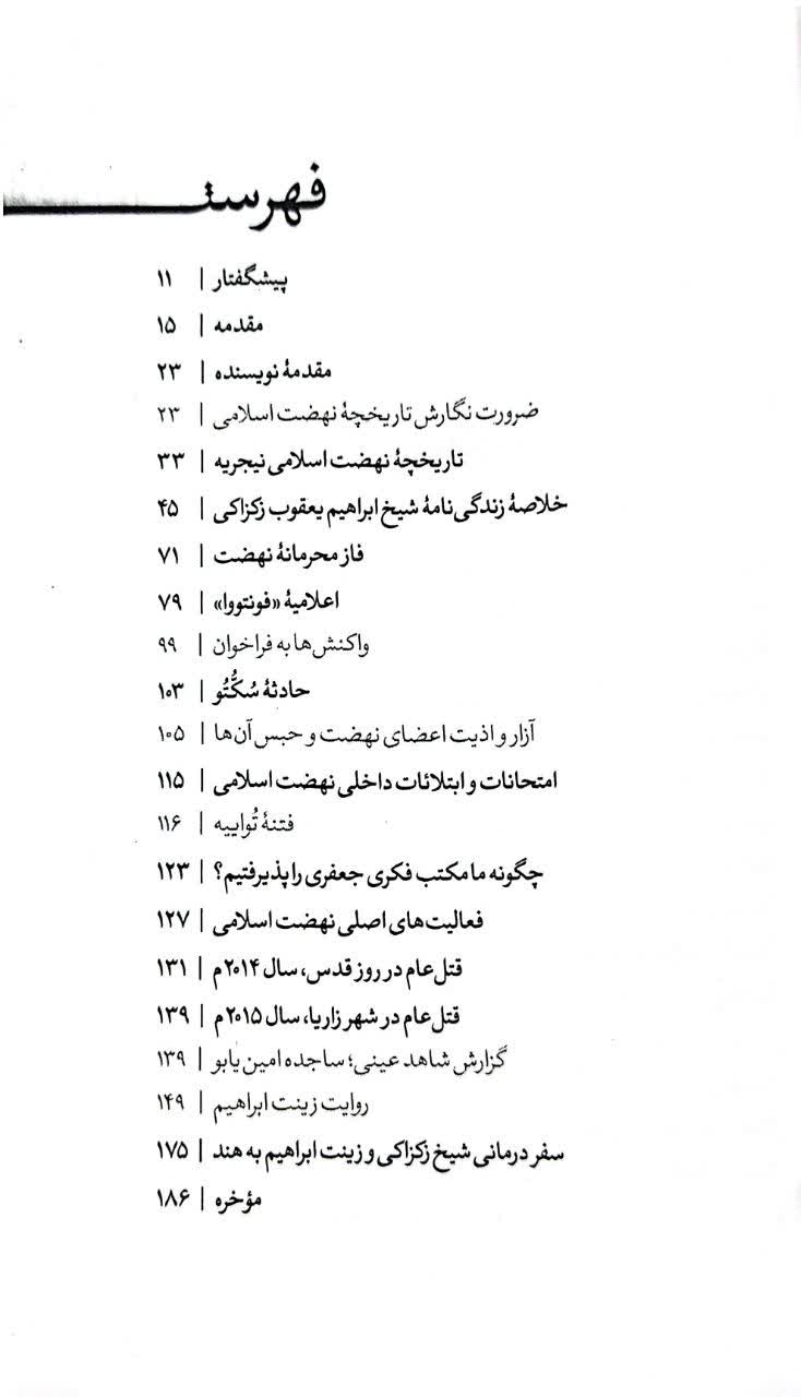 شیخ پرچم مبارزه را در سرزمینی برافراشت که طی دو قرن گذشته سفره استعمارگران غربی و آمریکایی بوده است. تاراج منابع طبیعی و تحمیل فقر بر مردم مظلوم نیجریه، بدعت و تحریف در اعتقادات دینی و نابودی هویت مسلمانان این کشور پهناور پاره‌ای از دستاوردهای این استعمار بوده است. شیخ طی چهار دهه مبارزه بی‌وقفه با استعمار داخلی و خارجی توانست روح آزادگی را به ملت مسلمان خود بازگرداند و آموزه‌های اصیل دینی را در دل آنها زنده سازد. کتاب حاضر تاریخچه این جنبش را از زبان نزدیک‌ترین شخص به شیخ زکزاکی، زینت ابراهیم، همسر شیخ، روایت می‌کند.