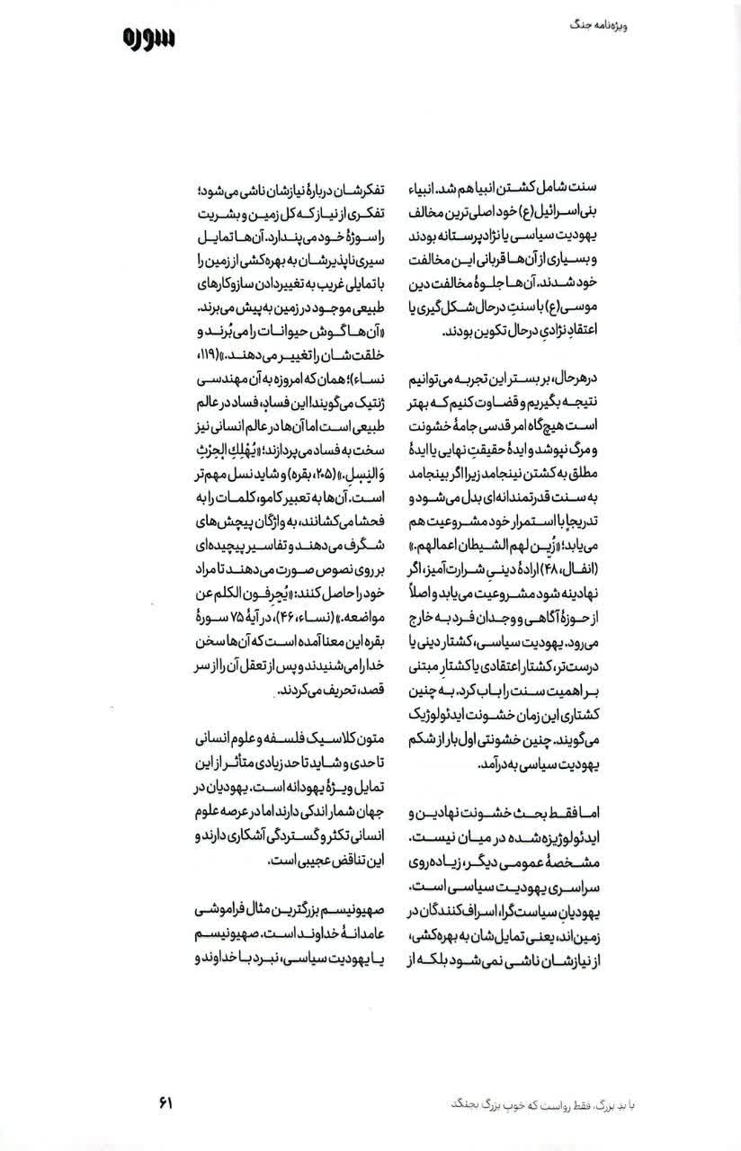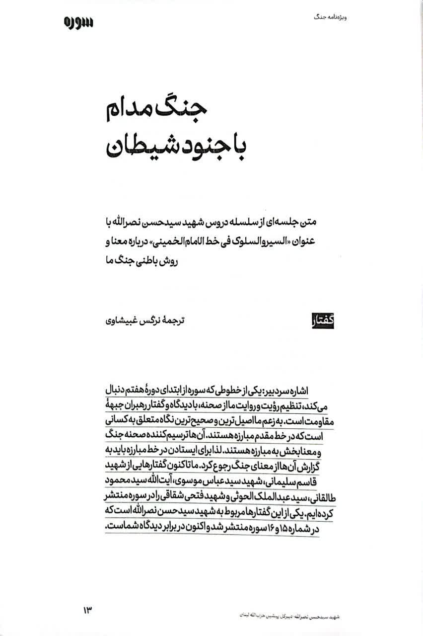 جنگ آغاز بارشهای بیامان تیر و ترکش است. اما این آغاز، آغازی بر حب وطن است، آغازی بر جداسازی خط فکری انقلاب از غربزدگان به اصطلاح روشنفکر و آغازی برای اتحاد. سرمقاله این ویژهنامه نشان میدهد بزرگترین هم سوره نشان دادن و گزارش کردن واقعیت جنگ در میدانهای گوناگون بود؛ اینکه ما کیستیم، با چه دشمنی میجنگیم و اینجنگ بر سر چست. فقط با این نگاه میتوان معنای مبارزه پیوسته ما و غرب را کشف و حفظ کرد. دومین گفتار این مجلد با ترجمه نرگس غبیشاوی به متن جلسهای از سلسله دروس شهید سید حسن نصرالله با عنوان «السیر و السلوک فی خط الامام الخمینی» درباره معنا و روش باطنی جنگ ما سخن میگوید. سپس به جنگ توحیدی به عنوان وسیله شناخت خدا اشاره میکند تا معنای جنگ از منظر امام خمینی (ره) را واکاوی کند. مروری بر بحران زن، زندگی، آزادی و عبور جمهوری اسلامی از این بحران، معنای آتش بس در منطق ما، تبلیغات جنگ، گفتوگو با استاد طاهرزاده درباره جنگ دوازده روزه، مروری بر تاریخ آینده بشر با جنگ ناگزیر میان آرمانگرایی صهیونیسم و ایده ایرانیت، موخرهای بر رمان «خار و میخک» یحیی السنوار و ... برخی از موضوعات مطرح شده در این مجله هستند.