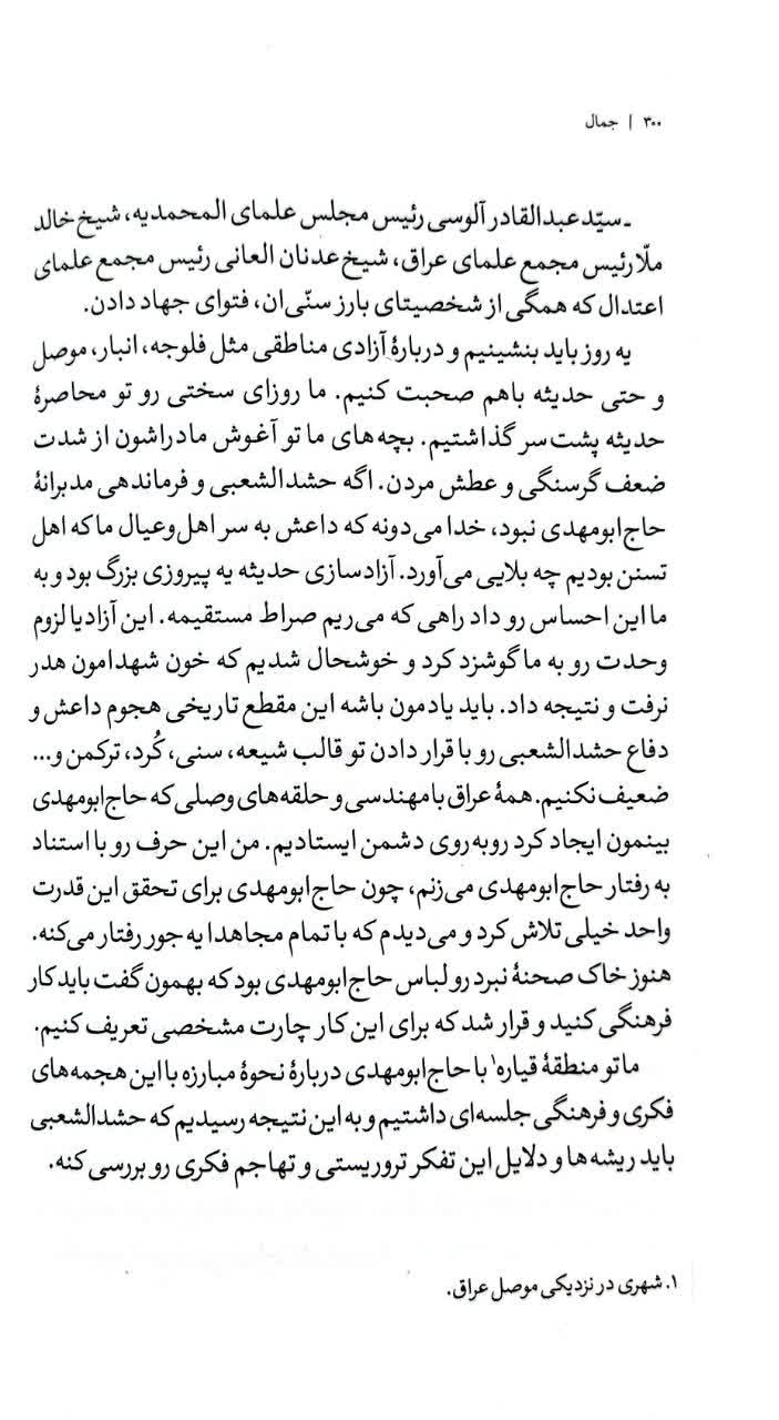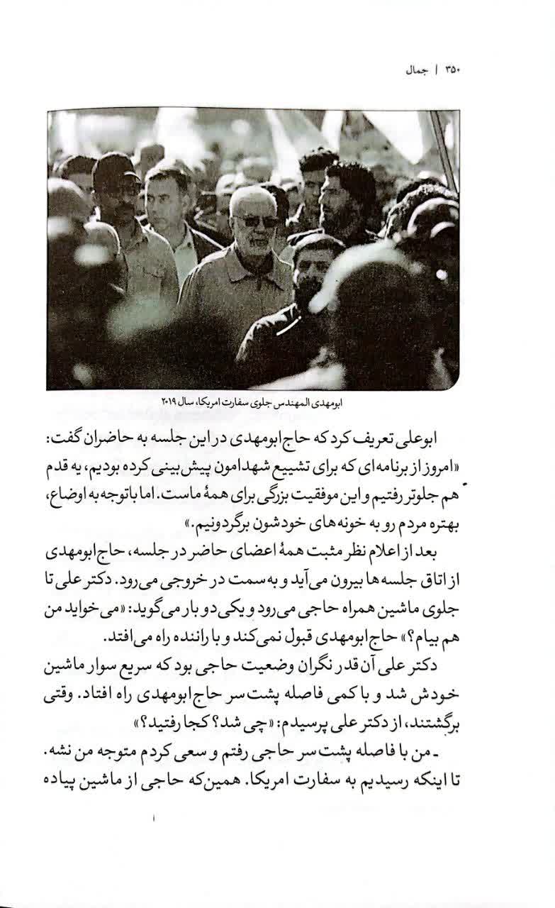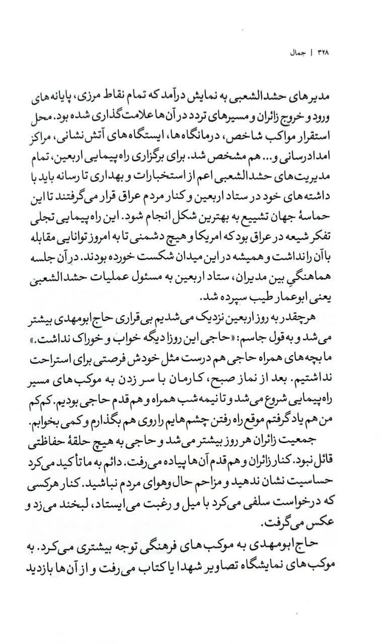 اندکی خاطراتمان را مرور کنیم. روزگاری بود که که از همسایگان غربی ایران خبرهای عجیب و غریبی به گوش میرسید. داعش هر روز جنایتی جدید رو میکرد و توحش خود را به جهانیان اثبات میکرد. موسسان داعش و استکبار جهانی با فروش اسلحههای خود و ناامنی در خاورمیانه سود هنگفتی به جیب میزدند. داعش در آرزوی ورود به ایران بود اما شیرمردانی چون ابومهدی المهندس و حاج قاسم این جنگ را خنثی کردند. کتاب جمال حکایتی است از مرد جهاد و همراهی او با حاج قاسم در خنثیسازی توطئه دشمن. هر فصل به ماموریتی خاص و برهه زمانی خاصی اختصاص دارد و از دل مبارزات برمیخیزد. از حضور ابومهدی المهندس در حلبچه، چند ساعت قبل از حمله شیمیایی در سال 1985 تا حضور در کردستان عراق، از دیدارهای مردمی تا دیدار با شهید محمدباقر حکیم و ... را در کتاب جمال ورق خواهیم زد.