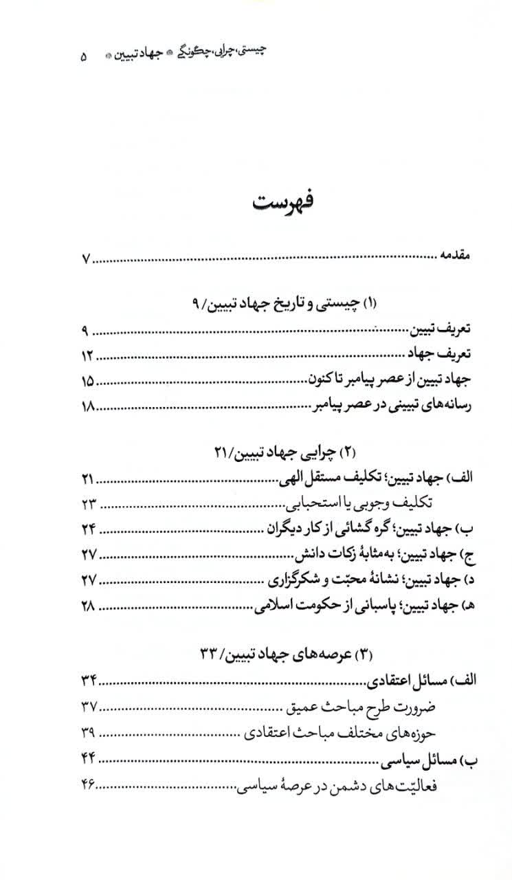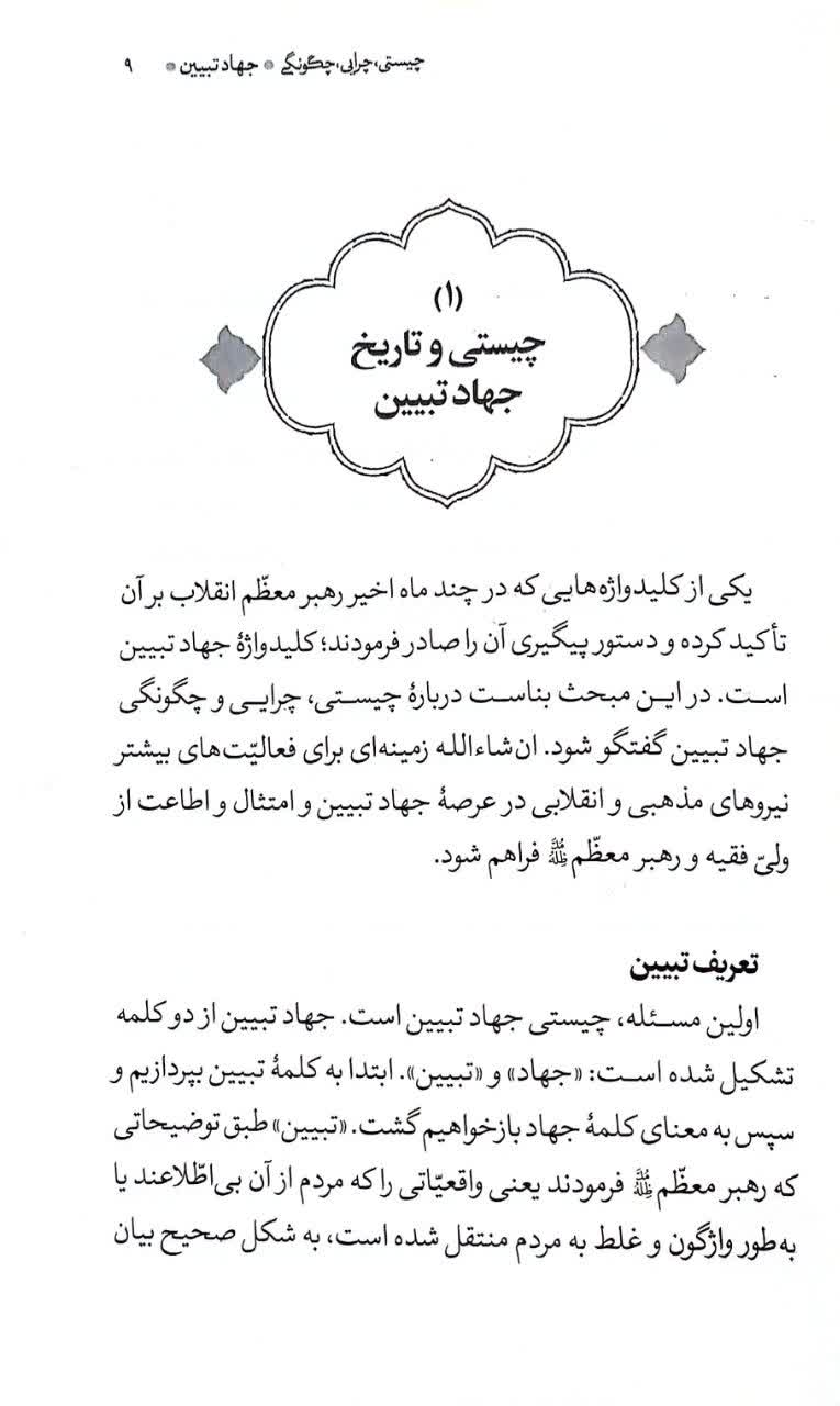 کتاب حاضر با عنوان جهاد تبیین در فصل نخست خود به چیستی و تاریخ جهاد تبیین میپردازد. بنا به فرمایشات رهبر معظم انقلاب تبیین یعنی واقعیاتی را که مردم از آن بیاطلاعند یا به طور واژگون و غلط به مردم منتقل شده است، به شکل صحیح بیان کرده و حقیقت را به گوش مردم برسانیم. و جهاد یعنی جد و جهد در راه یک هدف ارزشمند. پس جهاد تبیین یعنی جهاد گونه در مسیر روشنگری اجتماعی عمل کنیم. در واقع باید «أَنْ تَقُومُوا لِلّهِ مَثْنى وَ فُرادى».