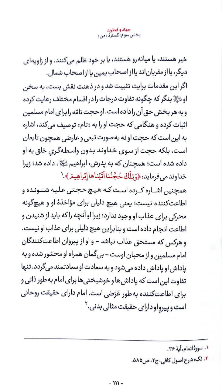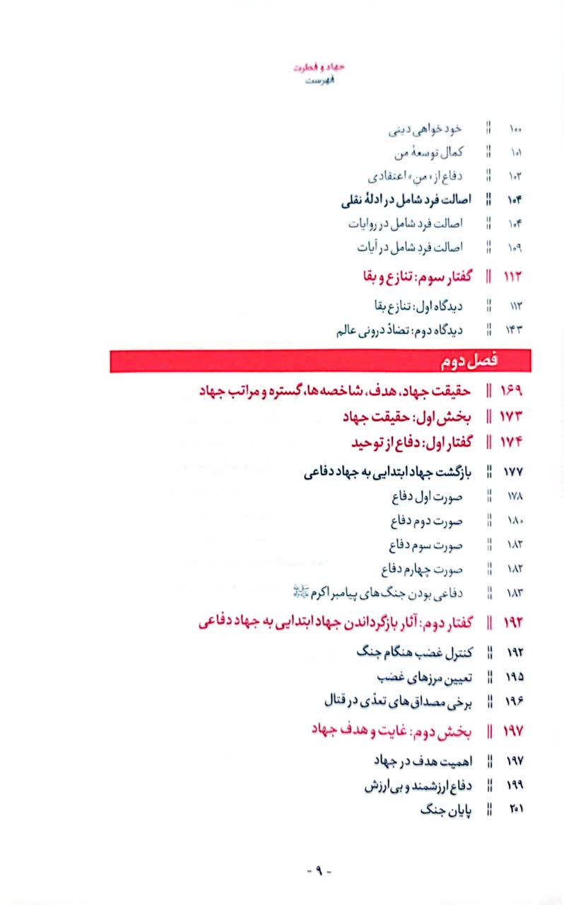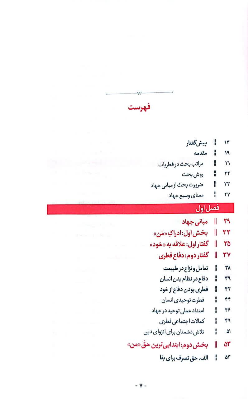 فصل اول کتاب با اتکا به تعامل و تنازع در طبیعت و فطری بودن دفاع، از فطری بودن جهاد میگوید. فصل اول کتاب از سه زیرفصل تشکیل شده است که ذیل عناوینی چون من حقیقی انسان، فطرت و نیاز به خالق، هویت بخشی دروغین شیطان به انسان، خودخواهی دینی و تضاد درونی عالم به گفتوگو میپردازد. فصل دوم کتاب از حقیقت جهاد، هدف، شاخصهها، گستره و مراتب جهاد میگوید. بر این اساس کتاب با سوالات زیر مواجه است: