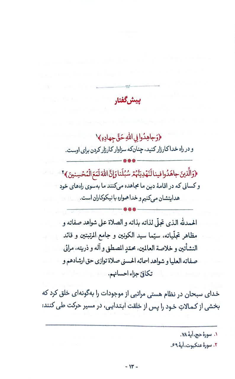 حجت الاسلام عابدینی با تکیه بر آیات قرآن کریم نشان میدهد جنگ برای مومن نجات و رهایی است و برای کافر عذاب و هلاکت. پس از این کتاب به دوگانه جهاد و انتظار میپردازد و خاطر نشان میکند که ظهور بسیاری از استعدادها در زمان ظهور با اتکا به جهاد رخ مینماید. گستره جهاد، جهاد با جان و مال، مراتب جهاد و شهادت، امر به معروف و نهی از منکر، مبارزه با طاغوت و عرصههای جهاد گوشهای از مطالب مطروحه در صفحات پایانی کتاب هستند.