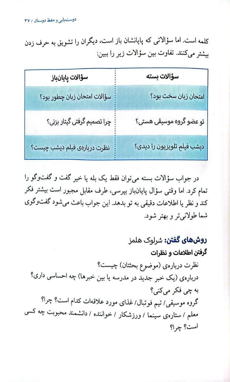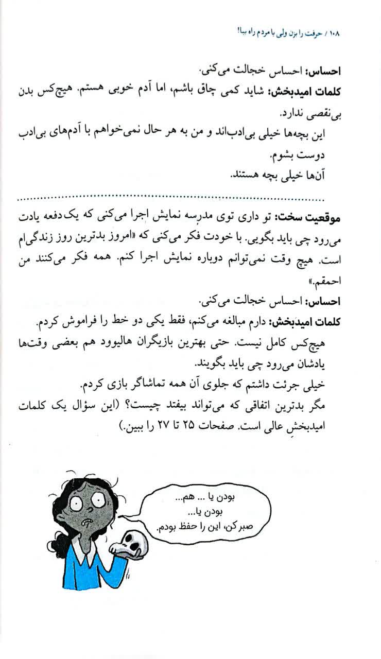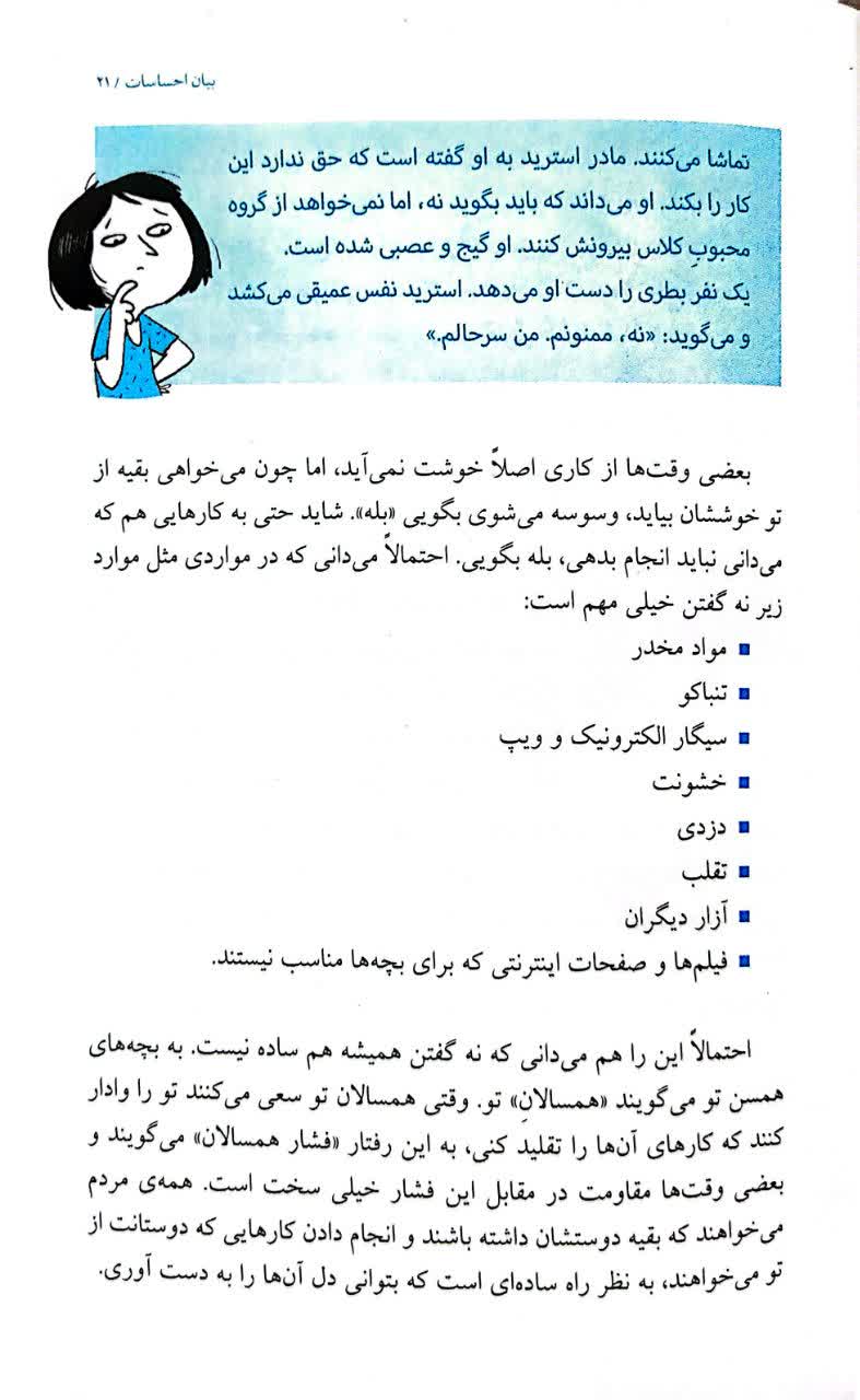 اما جر و بحثها را باید پایان داد. این مهمترین راه برای دوستیابی است. پس فصل سوم را با جدیت بیشتری مطالعه کنید. دیگر فصول کتاب با ادبیاتی روان و ساده مخاطب بالای هشت سال را با موضوعاتی چون جلوگیری از آزار و قلدری، کنار آمدن با سرزنشها و پس زدن افکار منفی آشنا میکند و در هر حوزه راهکار عملی مفیدی ارائه میدهد.