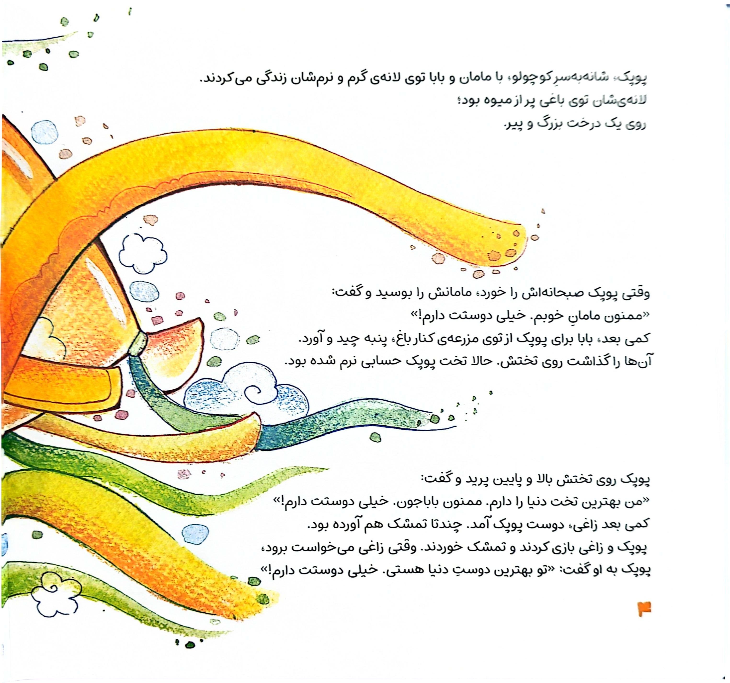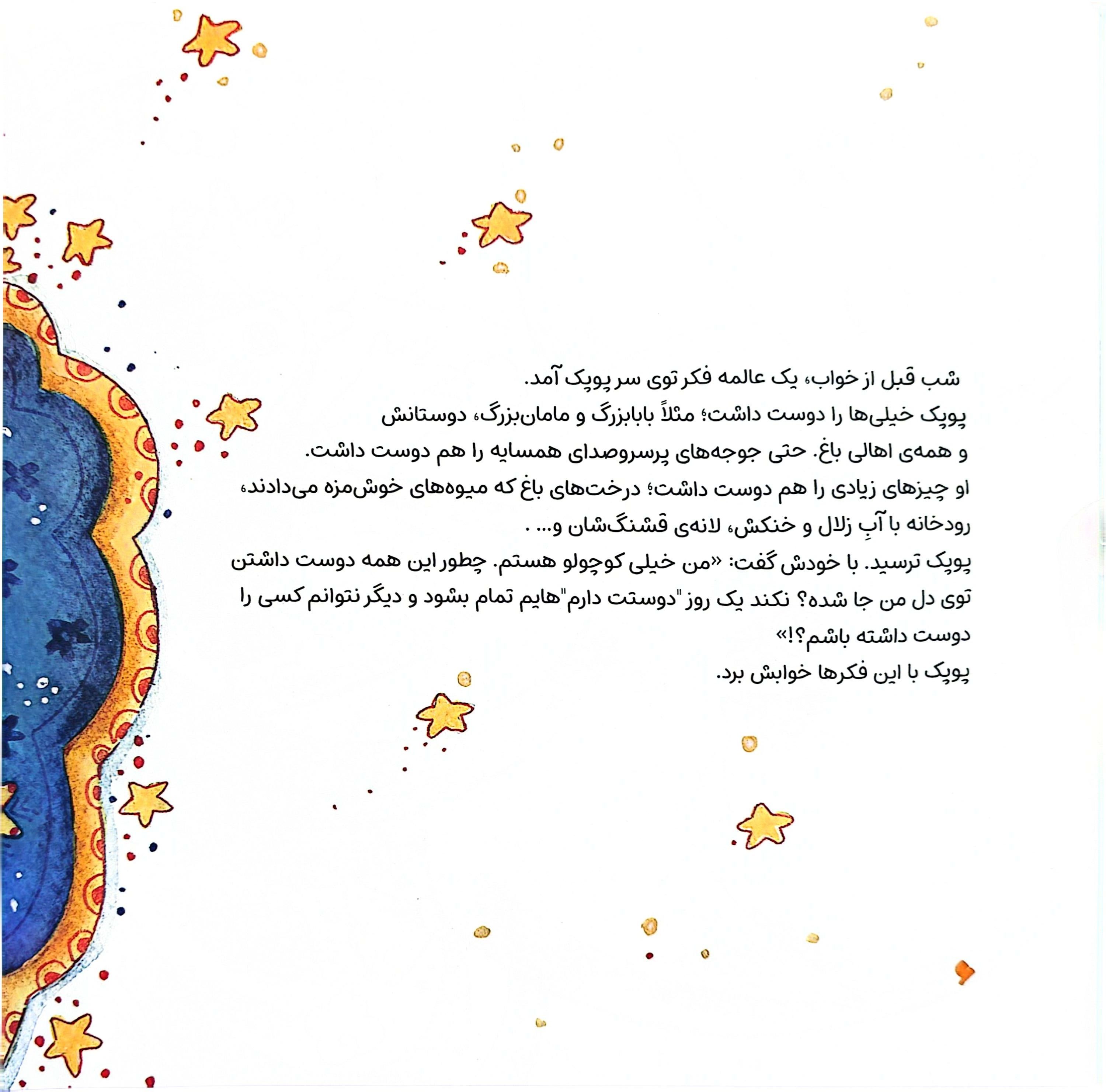 پوپک ترسید. با خودش گفت: من خیلی کوچولو هستم چطور این همه دوست داشتن توی دل من جا شده؟ نکند یک روز دوستت دارم هایم تمام بشود و دیگر نتوانم کسی را دوست داشته باشم؟!»