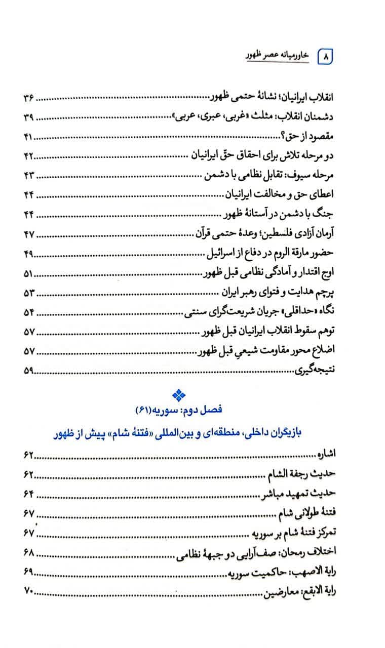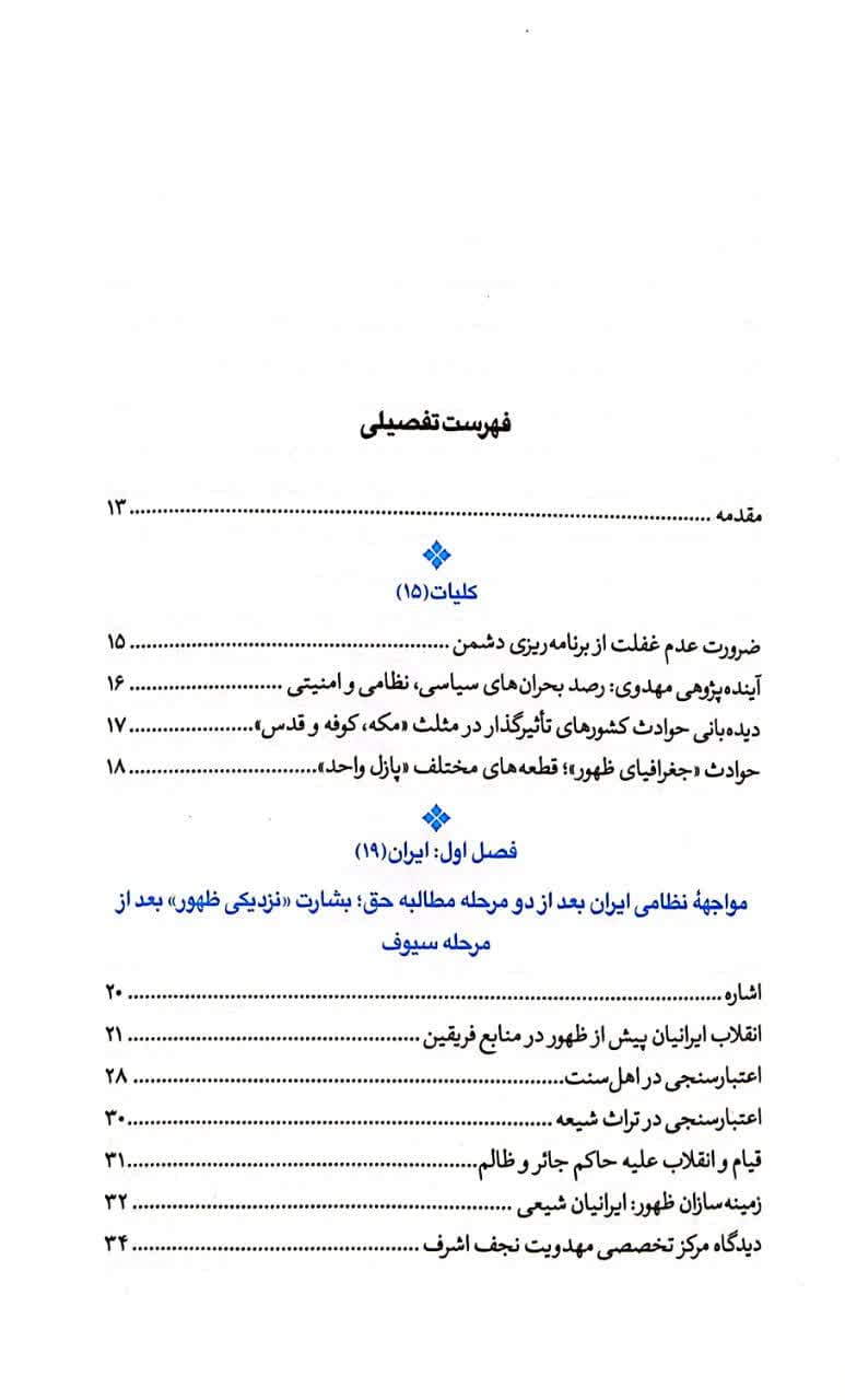 با توجه به اتفاقات اخیر سوریه، لبنان، فلسطین و اسرائیل حتما شما هم ظهور را نزدیک میدانید و جنگهای اخیر از علائم ظهور میدانید! اما واقعیت چیست؟ مصطفی امیری در کتاب حاضر به دنبال پاسخ به همین سوال است. او فصل اول کتاب را با عنوان ایران، به مواجهه نظامی ایران بعد از دو مرحله مطالبه حق، اختصاص داده است و آن را از نشانههای ظهور دانسته است. این اثر که با روش کتابخانهای و با رویکرد توصیفی-تحلیلی از منابع معتبر شیعه و سنی استفاده کرده در فصل اول خود به این نتیجه میرسد که قبل از ظهور، انقلاب و حکومت در ایران تشکیل خواهد شد که هدف اصلی خویش را زمینهسازی برای حکومت جهانی امام عصر (ع) میداند. در اثناء انقلاب ایرانیان دوبار حق غصب شده خود را از دشمن طلب میکنند، امام ممانعت دشمن در استیفای حق تنها راه مبارزه را باز میگذارد.