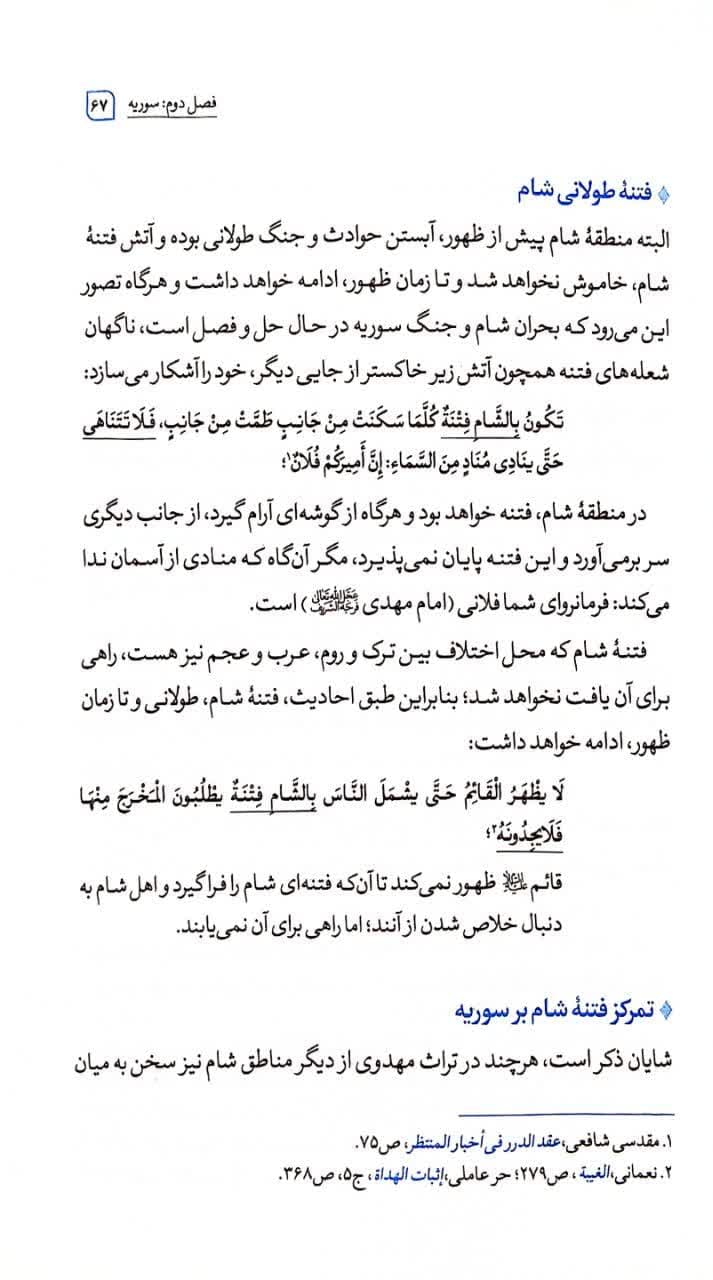 فصل دوم با عنایت به احادیث «رجفهالشام» و «تمهید مباشر» از فتنه طولانی شام و بالاخص سوریه میگوید. همچنین «هرجالروم» از یک جنگ جهانی دیگر با محوریت کشورهای روم و اروپایی خبر میدهد. ورود نظامیان غربی به فتنه شام در حمایت از اسرائیل، حاکمیت سفیانی در دمشق پیش از ظهور و حمله اخوانالترک به شرق سوریه برخی از حوادث ذکر شده در این خطه جغرافیایی هستند.