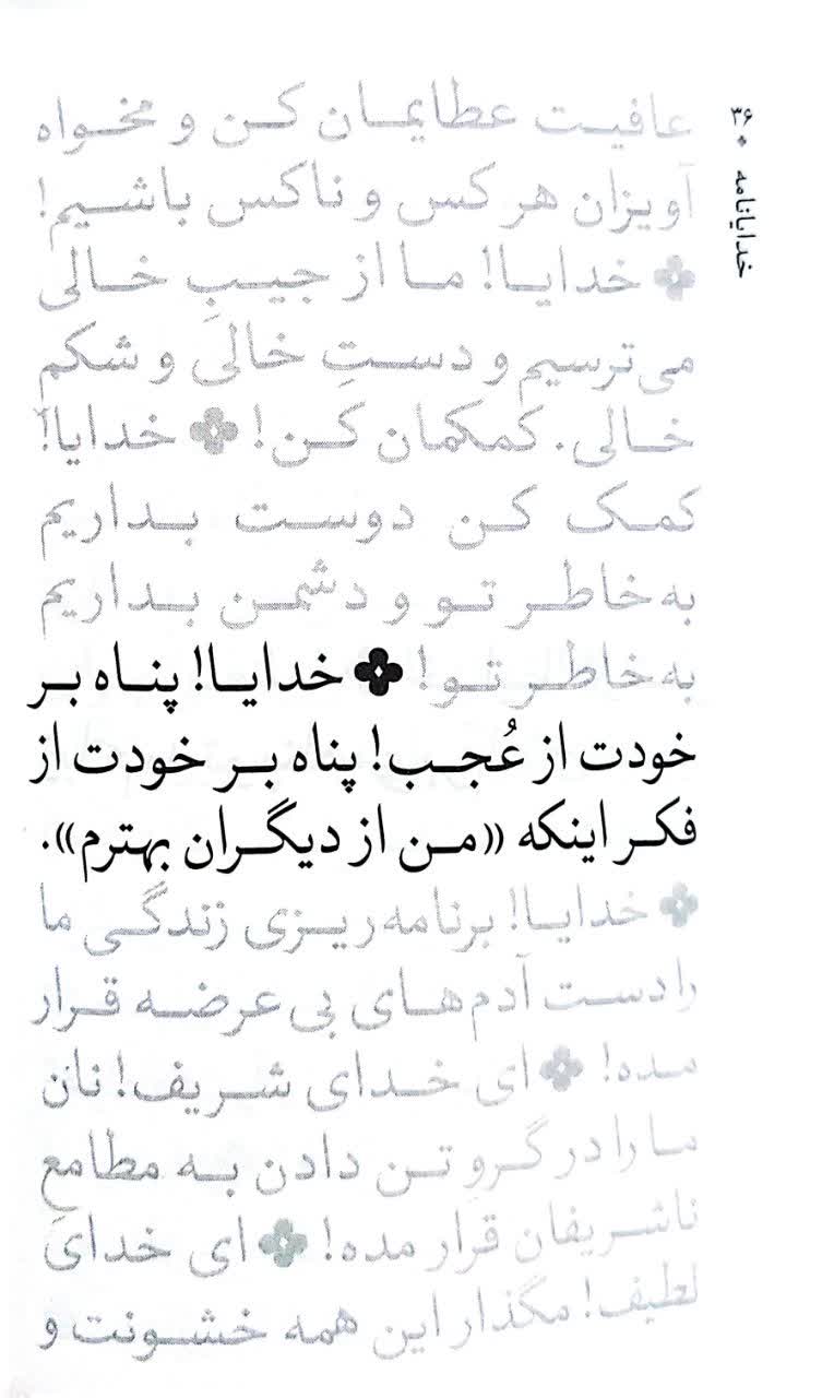 کتاب خدایانامه به قلم عباس حسیننژاد با ادیاتی خودمانی، رسمی، عارفانه، عالمانه، عامیانه، محرمانه، مردانه، زنانه و خلاصه هزار و یک جور ادبیات طنز و جدی میخواهد مخاطب را به راز و نیاز و دعا در برابر خالق هستی دعوت کند. این کتاب در قطع جیبی و با صفحه آرایی بینظیرش در دست هر کتابخوان و کتابنخوانی دلبری میکند تازه حوصلهتان را هم سر نمیبرد. فقط همه کتاب را یک نفس نخوانید؛ بگذارید جملات جدیدی برای مناجات با خدا داشته باشید تا فرشتهها را سورپرایز کنید.