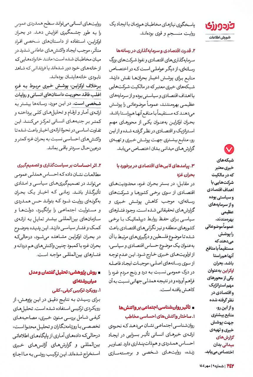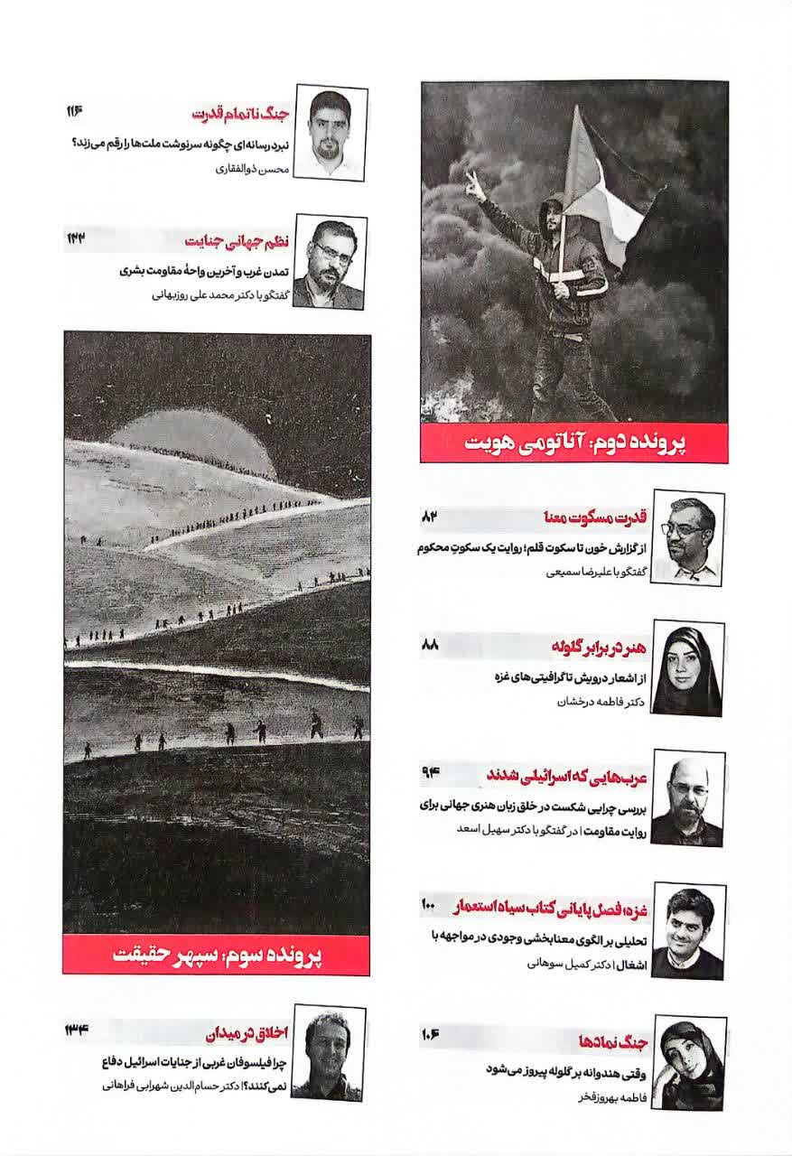جلد نهم این فصلنامه با آثاری از فؤاد ایزدی، حسین شهرستانی، علی انتظاری، علیرضا سرلک، مهدی خانعلیزاده، علیرضا سمیعی و ... به مسئله فلسطین، سازمانهای بینالمللی و بیداری جهانی میپردازد. در ابتدا با نوشتاری از فؤاد ایزدی مواجه میشویم که ادعا میکند فلسطین همچنان در قلب تاریخ میتپد و اسرائیل بنیادی کاذب است که بر ویرانههای عدالت بنا شدهاست. دیگر مقالات فصلنامه نیز همین موضوع را تصریح میکنند و بر این ادعا صحه میگذارند. دومین مقاله به قلم مجید رحیمی، سردبیر فصلنامه، از چرایی سکوت جوامع بینالمللی در برابر جنایات علیه کودکان میگوید و عمق شکافهای شناختی، روانی و اخلاقی جوامع انسانی را واکاوی میکند. اینکه «چرا جهان به راحتی این حجم از کشتار فلسطینیان را تاب میآورد» را باید در مقاله سرکار خانم فاطمه داداشی جستوجو کرد: در روایت از رنج فلسطینیان، عناصر شخصیساز از بین میروند: نام، سن، چهره، خانواده، رؤیا و ... . در غیاب این عناصر، تصویر کودک غزهای تنها یک عدد دیگر در آمار میشود. مجله با همین سبک و سیاق پیشمیرود و از دیدگاه فرهنگی، اجتماعی و سیاسی چرایی و چگونگی رنج فلسطین را بررسی میکند.