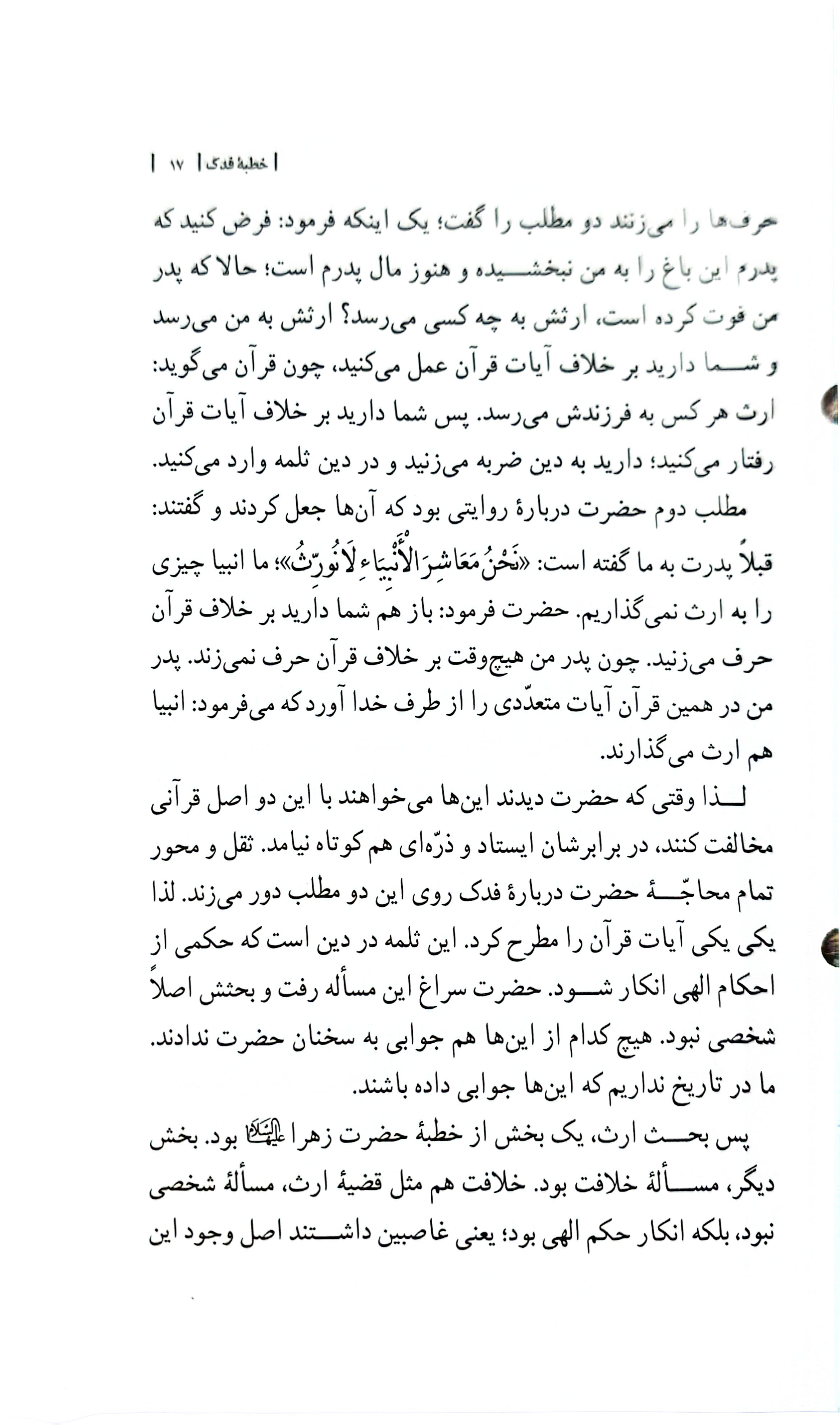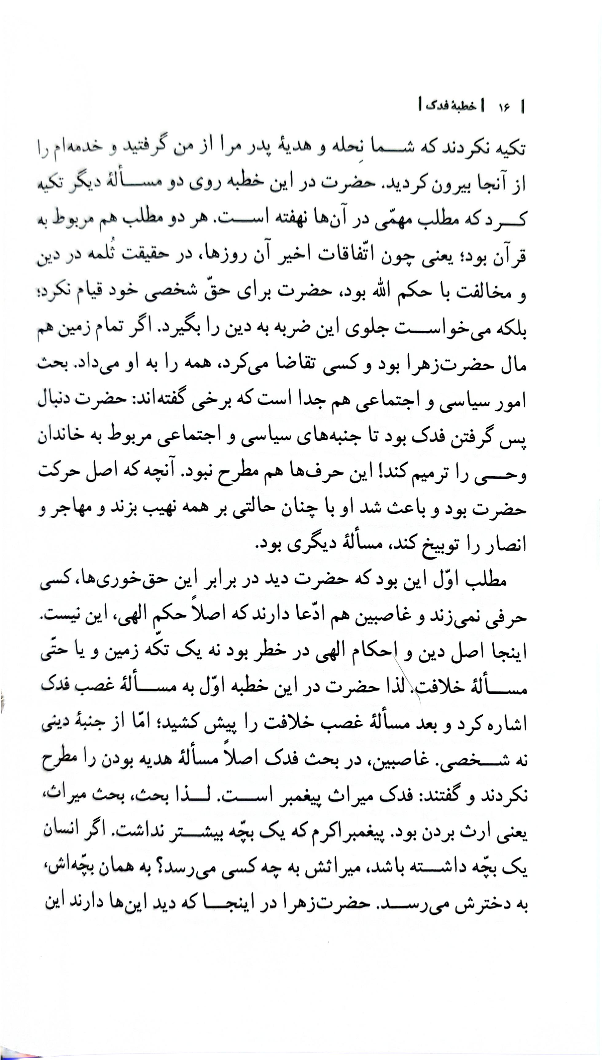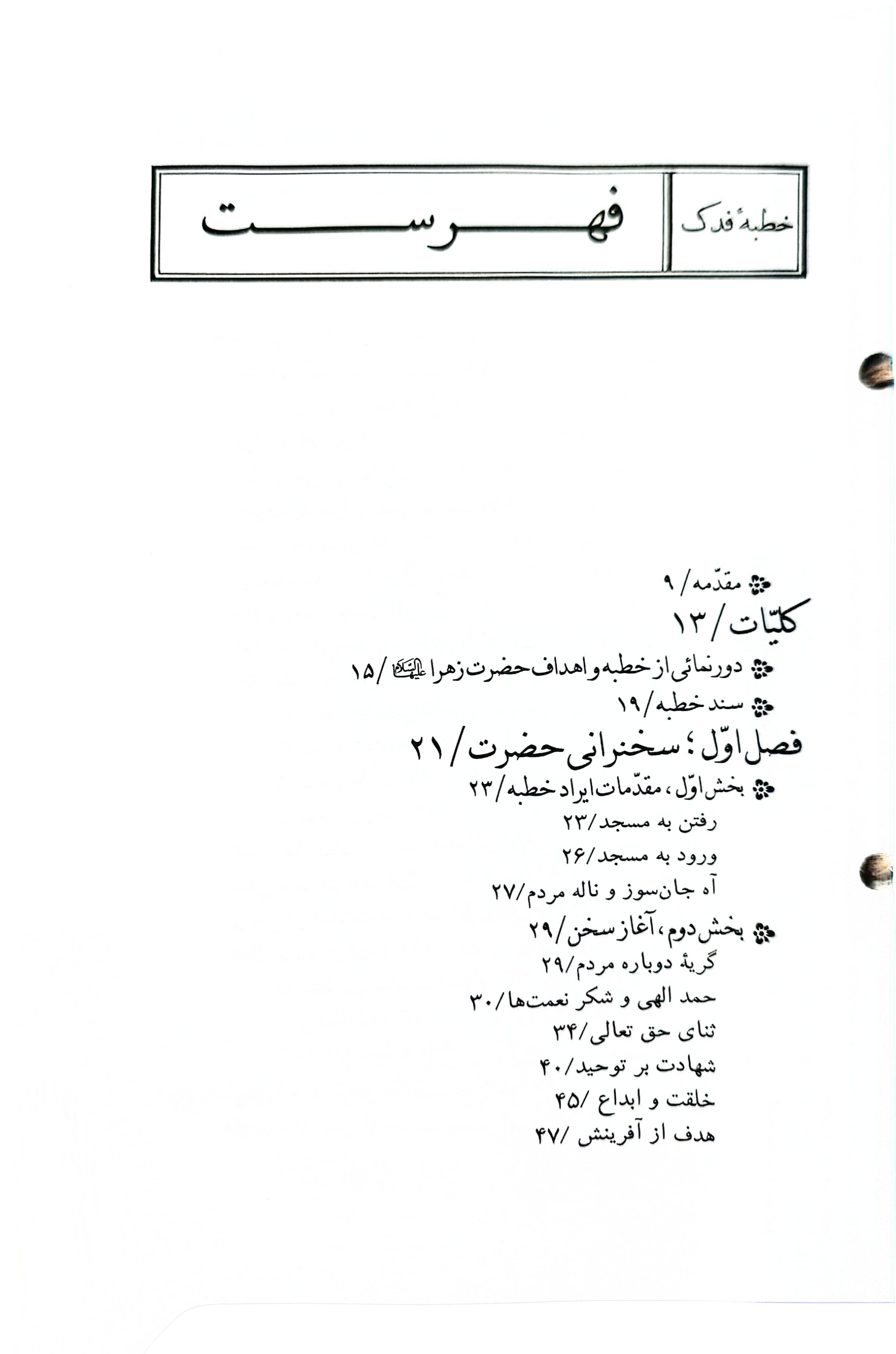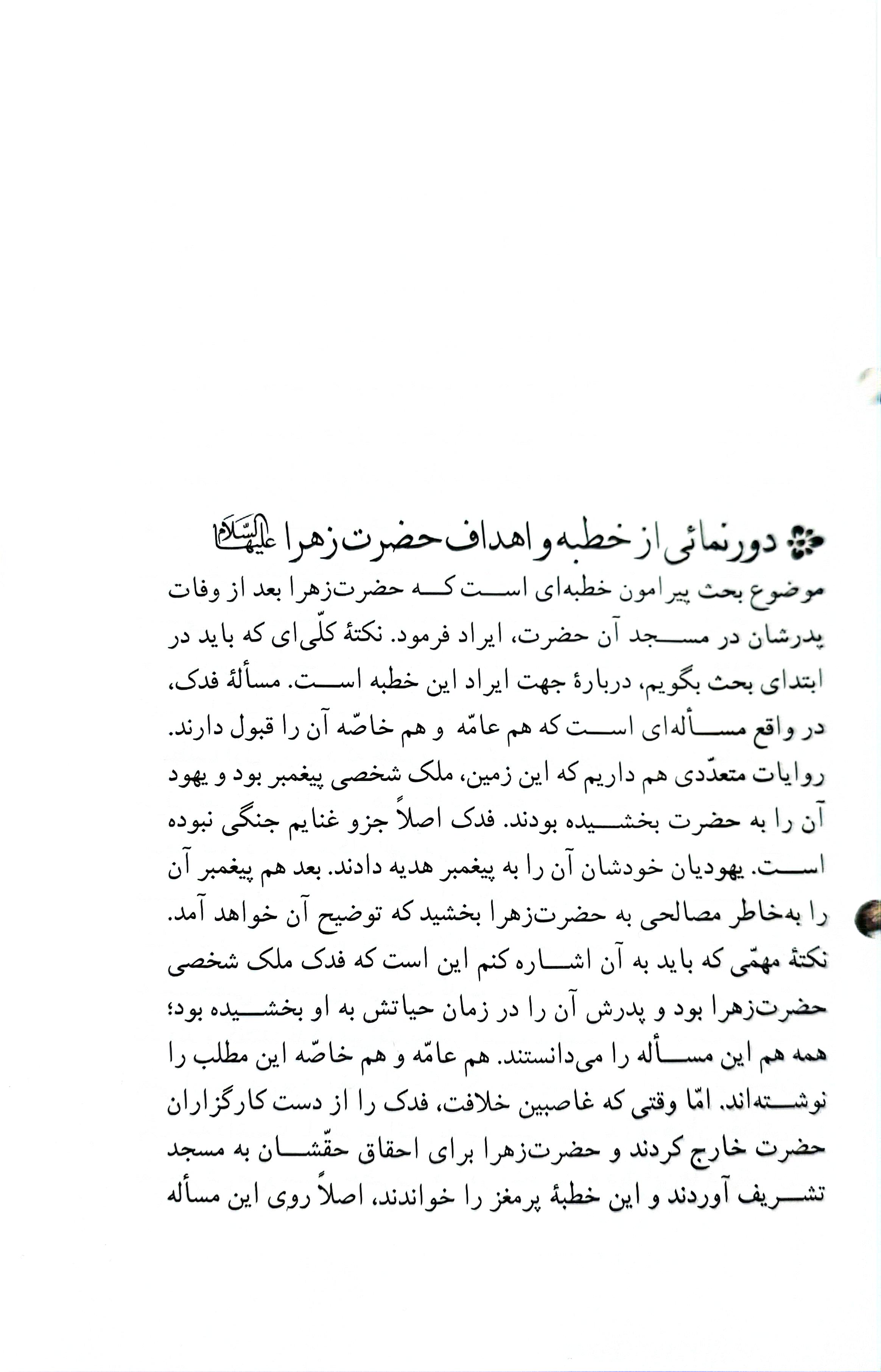 پس از رحلت رسول اکرم دو حادثه مهم و سرنوشت ساز روی داد که تمامی حوادث بعد از خود را تحت تأثیر قرار داد. این دو حادثه یکی تشکیل سقیفه و غصب خلافت مسلمین و دیگری غصب «فدک» یعنی قطعه زمین اهدایی پیغمبر گرامی اسلام به دخترش فاطمه زهرا این بود. پس از مدت بسیار کوتاهی از این دو رویداد و بعد از چند بار پیگیری برای بازپسگیری فدک و بینتیجه بودن آن حضرت زهرا این در مسجد النبی لال حاضر شد و خطبهای را در حضور مهاجرین و انصار ایراد فرمود که از آن پس به خطبه فدک معروف گردید. این خطبه نه تنها مسائل مربوط به فدک را به خوبی حق اهل بیت در آن را به روشنی اثبات میکند بلکه مشتمل بر مضامین بلند در معارف اعتقادی است. بیان اصول اعتقادی با بیانی شیوا از توحید گرفته تا نبوت و معاد اسرار احکام و اوامر و نواهی الهی، ذکر وضع مردم قبل از بعثت رسول خدا، مبارزات و سختی های پیامبر و على برای پیروزی و تثبیت دین خدا، فتنههای دشمنان و برخی منافقان در تمام این زمانها، تعیین جانشینی علی (علیه اسلام) از طرف خدا در روز غدیر، رحلت پیامبر و عهد شکنی اصحاب، غصب خلافت و مخالفت با حکم خدا در قرآن غصب فدک و کنار زدن احکام ارث و هبه و بسیاری موضوعات دیگر از جمله مطالب این خطبه است که در نهایت اختصار و در اوج استحکام و زیبایی بیان شده است. حضرت آیت الله العظمی حاج آقا مجتبی تهرانی که سالها است شمع فروزان وجودش، محفل شیفتگان مکتب اهل بیت را روشنی و گرمی میبخشد و چشمه زلال دروس مختلف ایشان، مشتاقان معارف حقه را متناسب با سطح فکری و میزان طلبشان سیراب میکند در سال ۱۳۷۴ طی ۱۷ جلسه به شرحی مختصر از خطبه حضرت زهرا پرداختند.