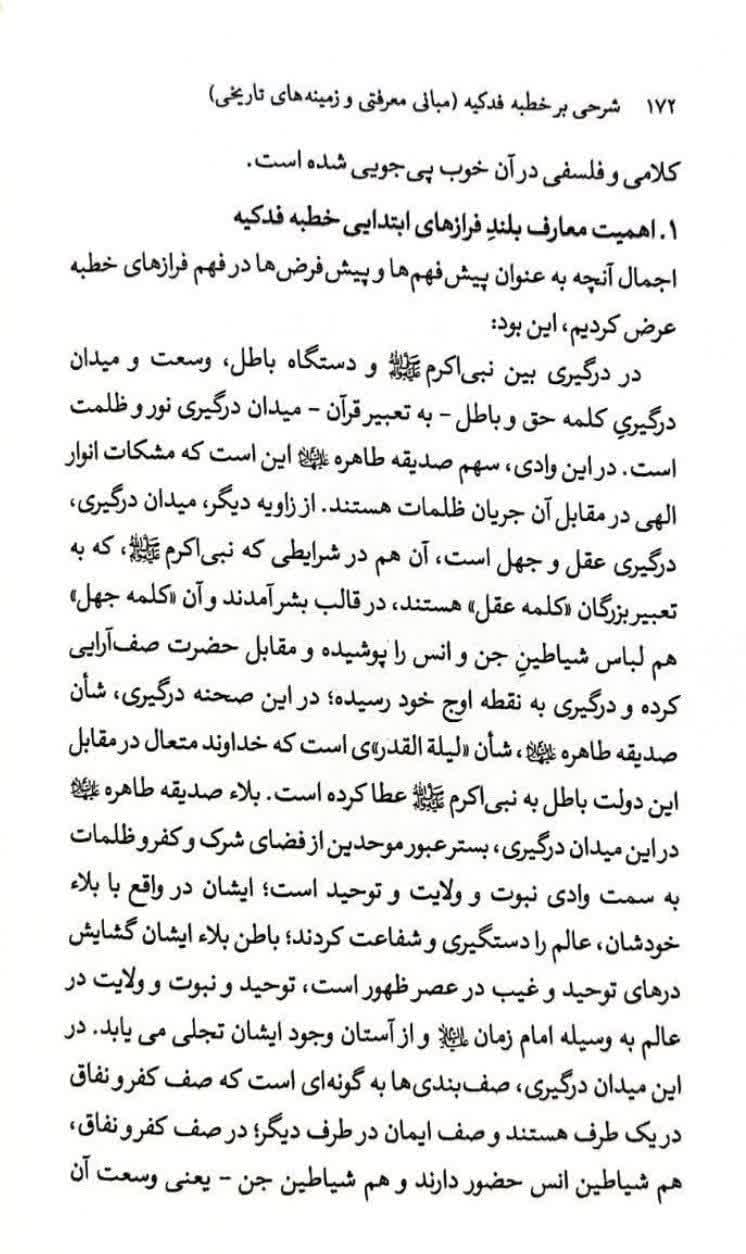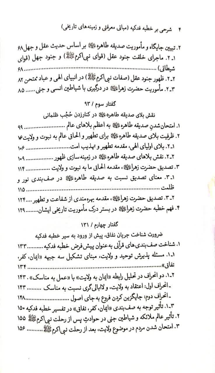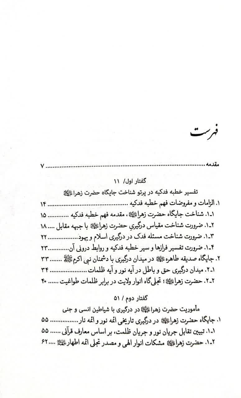 استاد میرباقری در جستار حاضر به تفسیر خطبه فدکیه در پرتو شناخت جایگاه حضرت زهرا میپردازد. ایشان پس از بیان صفات و ویژگیهای حضرت به تبیین جریان نور و جریان ظلمت بر اساس معارف قرآنی میپردازند. بر مبنای دیدگاه استاد میرباقری نقش بلای حضرت، کنار زدن حجب ظلمانی برای هدایت تاریخ به سمت خدا میباشد. گفتار چهارم کتاب شناخت جریان نفاق را پیش از سیر در خطبه فدکیه لازم وضروری میداند. این بخش دو انحراف در امت رسول خدا را بازگو میکند. انحراف اول پسزدن ولایت و لاابالیگری نسبت به مناسک است و دومین آن جایگزینی فروع به جای اصول است. در پایان مهمترین گفتار کتاب ضمن برشمردن درسهای الهی و معنوی خطبه از آشکارسازی جریان نفاق، عاقبت شوم این جریان و بلاهای پیشروی امت اسلام سخن میگوید.