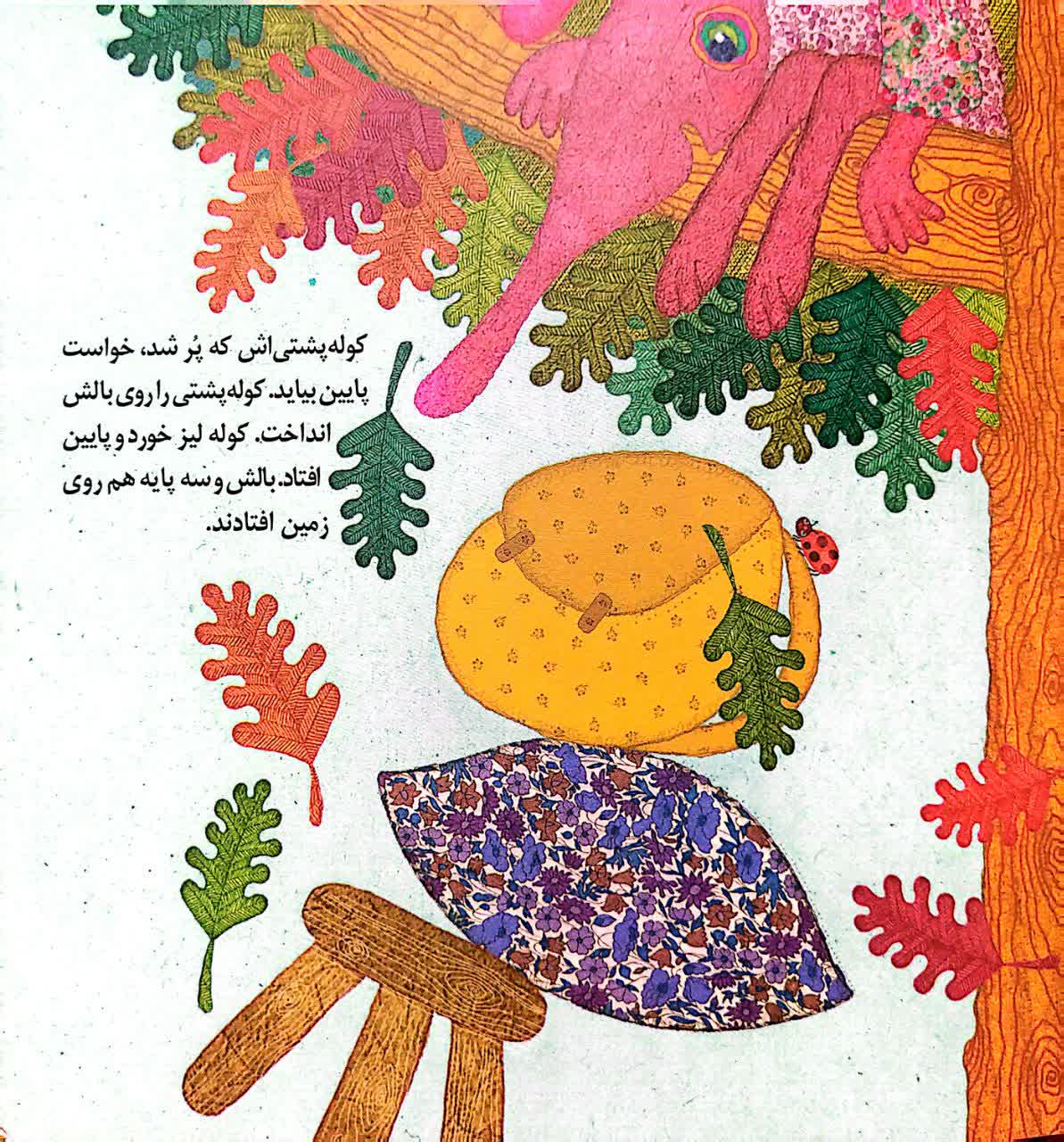 کوله پشتیاش که پر شد خواست پایین بیاید. کوله پشتی را روی بالش انداخت. کوله لیز خورد و پایین افتاد. بالش و سه پایه هم روی زمین افتادند.