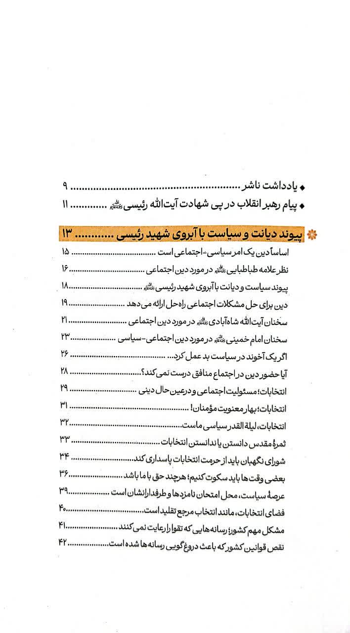 فصل اول کتاب دین را از حوزه زندگی فردی بیرون میکشد و اساسا آن را یک امر سیاسی-اجتماعی میداند. در واقع معتقد است «دیانت ما عین سیاست ماست و سیاست ما عین دیانت ماست». کتاب در تایید این حقیقت به نظر علامه طباطبایی در مورد دین اجتماعی اشاره میکند و سپس از پیوند بین سیاست و دیانت با آبروی شهید رئیسی سخن میگوید. از دیدگاه کتاب انتخابات مسئولیتی اجتماعی و در عین حال دینی است و لیلهالقدر سیاسی ماست.