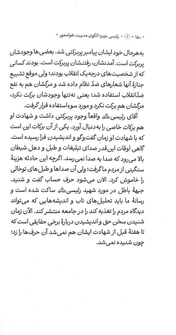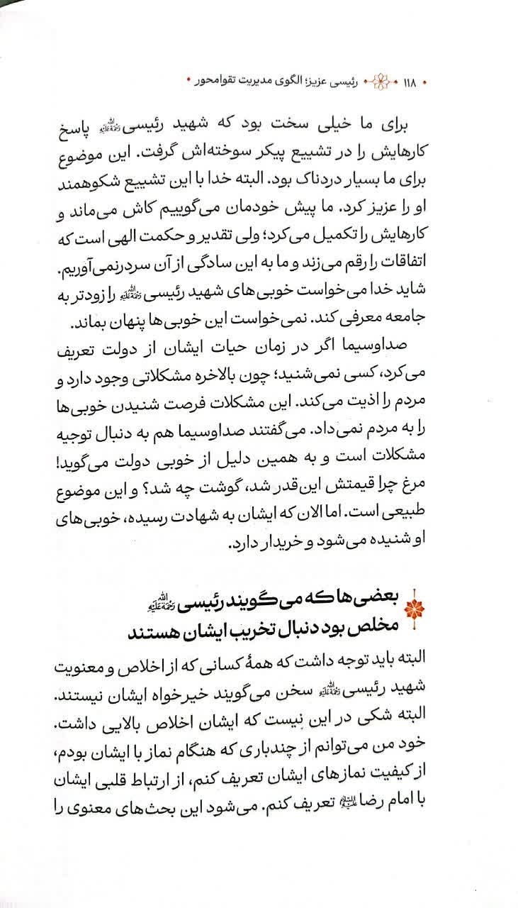 فصل سوم کتاب ویژگیهای مدیریتی شهید رئیسی را بازگو میکند. برخی از این ویژگیها عبارتند از: مردمی بودن به معنای واقعی کلمه، پایبندی به اقتصاد مردمی، کار برای خدا به مثابه کار برای مردم، پیشقدم بودن فرمانده در گرههای عملیاتی، شناسایی دقیق معضلات و ... . از دیدگاه حجتالاسلام پناهیان شاخصههای مدیریت تقوا محور در دوره ریاست شهید رئیسی پیادهسازی شدهاست و دیگر فصول کتاب این الگوی عملی را پیادهسازی میکند.