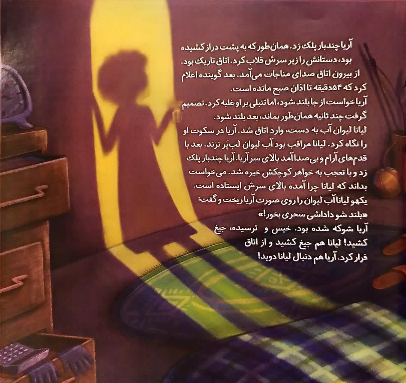 دوستانش که روزه نبودند، با حسرت نگاهش میکردند. چند نفر که حسودیشان شده بود، به او خندیدند و گفتند: «حتما روزه ی کله گنجشکی نه؟» آریا سینه جلو داد و با غرور گفت نه خیر، روزه کامل. تا زنگ دوم، حال آریا خوب بود، اما زنگ سوم کمکم شکمش شروع کرد به قار و قور کردن و گلویش خشک شد. خیلی تشنه شده بود. وقتی دوستانش در حیاط شروع کردند به خوردن لقمه و تغذیهای که از خانه آورده بودند آریا کم مانده بود زار زار گریه کند. خیلی گرسنه اش شده بود. آرزو کرد زنگ تعطیلی را زودتر بزنند و او به خانه برود، اما بعد با خودش گفت خب بروم خانه چه کار کنم؟ من که روزهام. باید تا اذان مغرب تحمل کنم. باید طاقت بیاورم.
