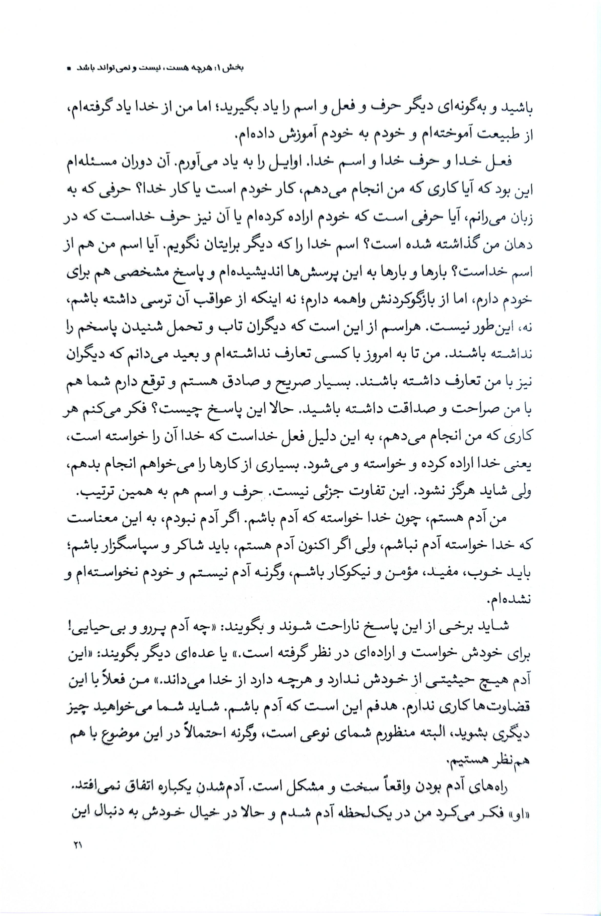 داستان از خطا، پشیمانی و سقوط آغاز میشود. با گریه و زاری و طلب بخشش و جستوجوی حقیقت ادامه مییابد. در این کاوش آدم تنها نیست و بار سنگین خودآگاهی و تردید را به دوش میکشد. او در تلاش برای شناختن خود، خدا و جهان ما را به مبارزه با غرور، حسادت و وسوسه میکشاند. مخاطب صرفا یک اثر داستانی را مطالعه نمیکند، بلکه تامل در فلسفه وجود، مبارزه با نفس، فلسفه زندگی، فلسفه مرگ را کلمه به کلمه در لایههای پنهان داستان حس میکند. داستان عممدتا از زبان حضرت آدم (ع) بیان میشود که جذابیت شیرینی دارد.