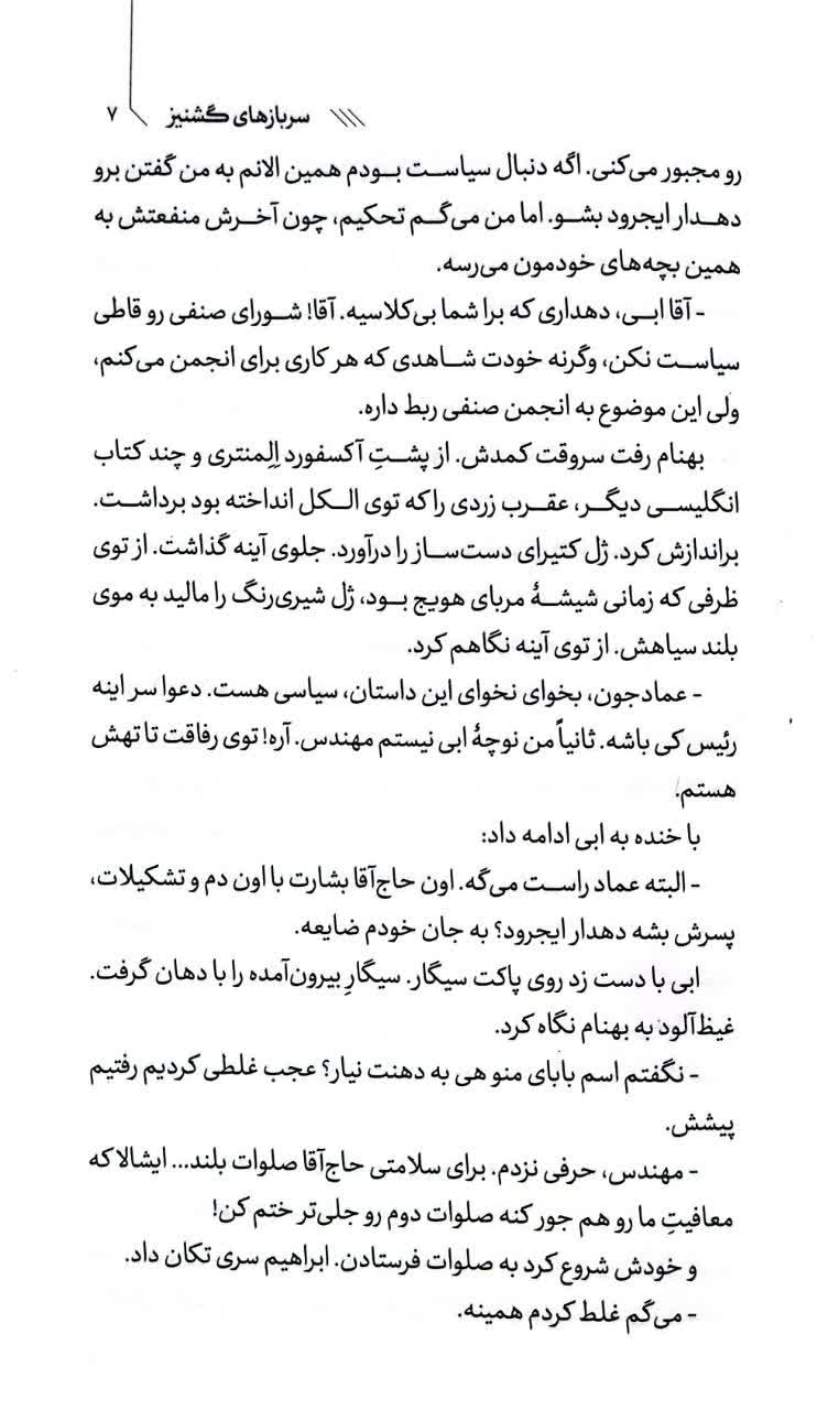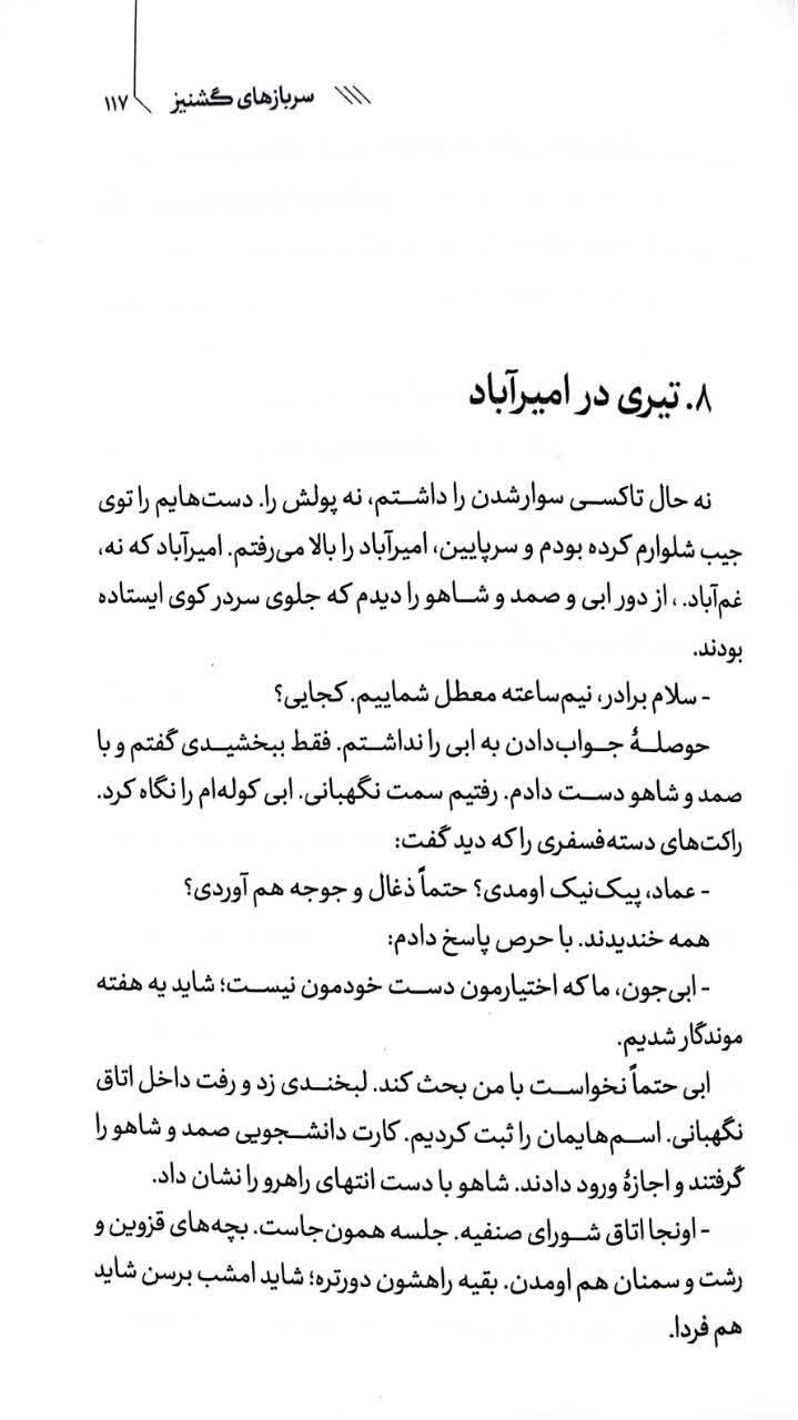 کتاب سربازهای گشنیز رمانی عاشقانه است در فضای دانشجویی و تشکلهای دانشجویی که حدود سالهای 77 روایت میشود. مهدی ناظری به مدد نشر سیمرغ توانسته داستانی پر کشش را روایت کند که در هیاهوی اعتراضات صنفی دانشجویان به بهانه شعر به عاشقی میرسد.
