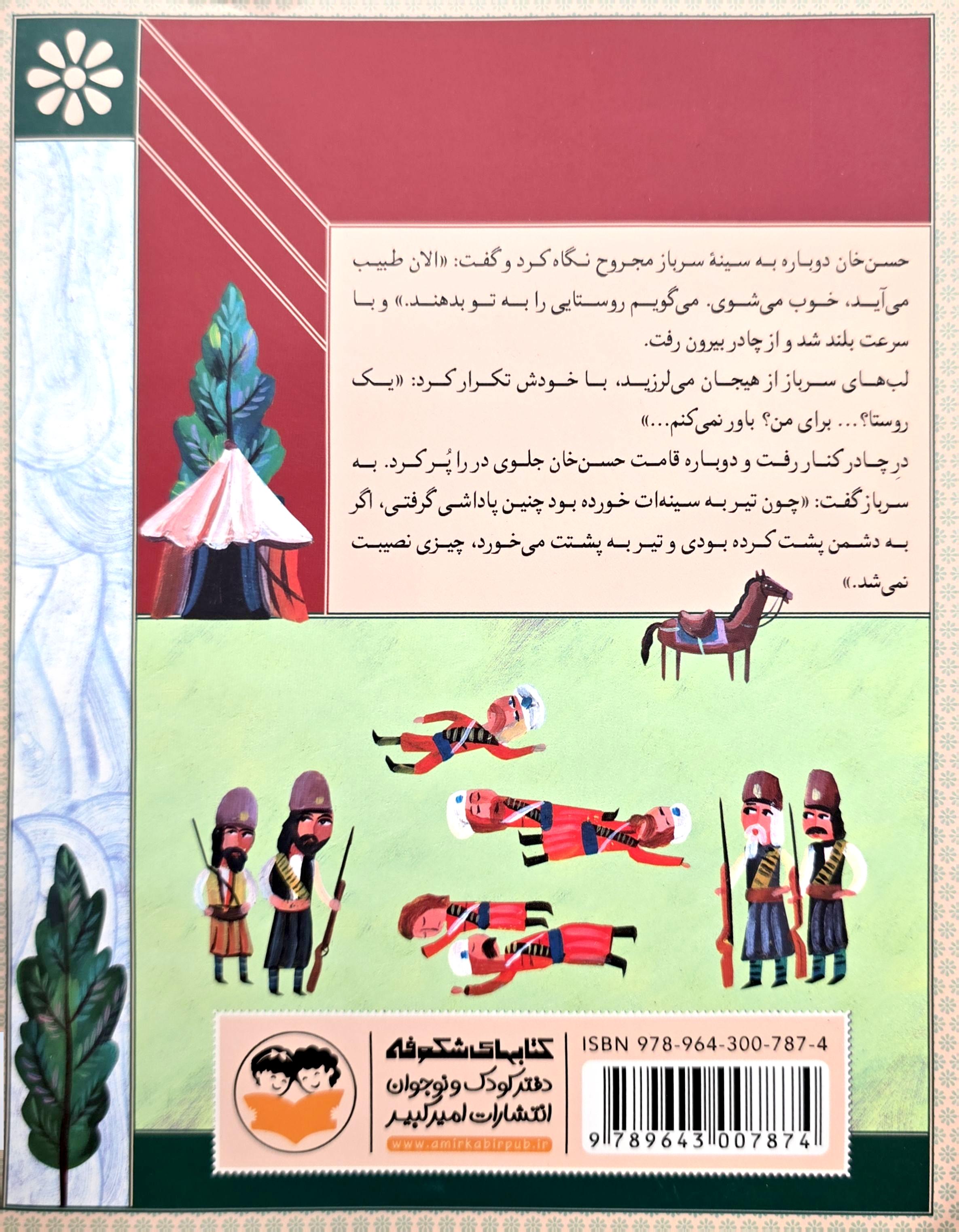به طرف اسبش برگشت. زین اسب را محکم کرد و بعد به کمک سرباز افسر روس را از جا بلند کرد و روی زین انداخت در اردوگاه همه با دیدن اسبی که یک فرمانده مجروح روس را میکشید و میآورد دور آنها حلقه زدند. اسب را نزدیک چادر حسن خان نگه داشتند.