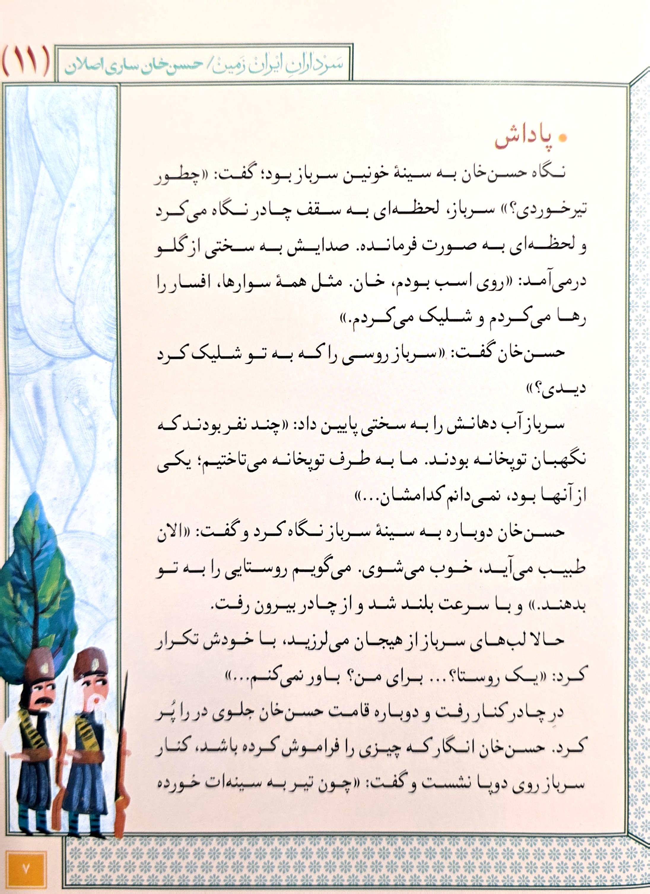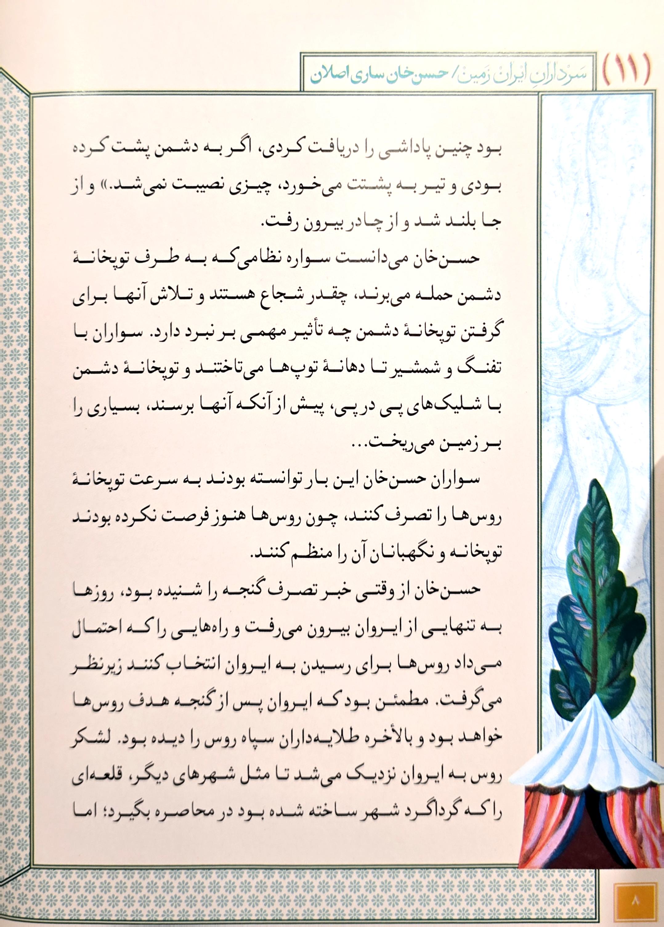 مجموعه سرداران ایران زمین به قلم خواندنی مهدی میرکیایی و تصویرگری سید حسام طباطبایی مجموعهای خواندنی است که زندگی سرداران بزرگ ایرانی را در دوران باستان، دوران مبارزه با استعمار گران اسپانیایی، پرتغالی و انگلیسی و حتی در دوران مشروطه، انقلاب، جنگ تحمیلی و ... روایت میکند. جلد یازدهم این مجموعه به زندگی حسنخان ساری اصلان اختصاص دارد. حسن خان ساری اصلان توانست بزرگترین شکست را در جنگ ایروان بر روسیه تحمیل کند.