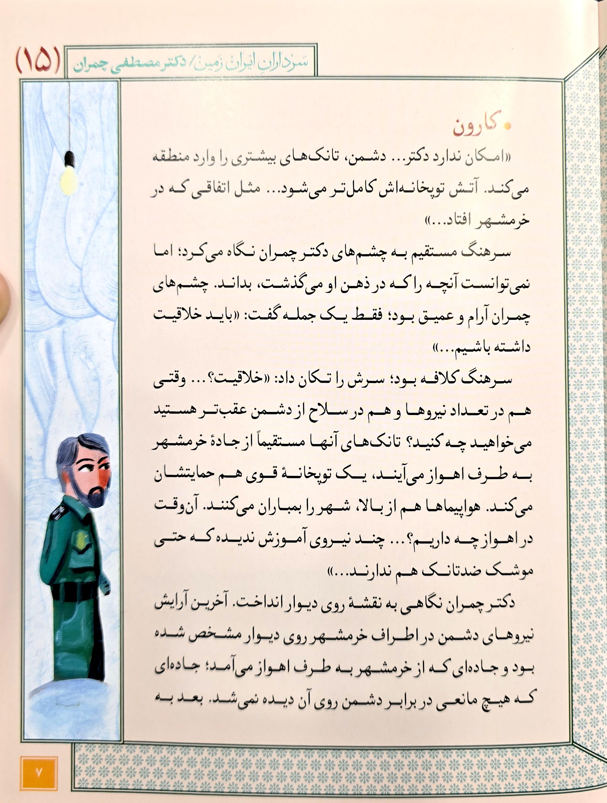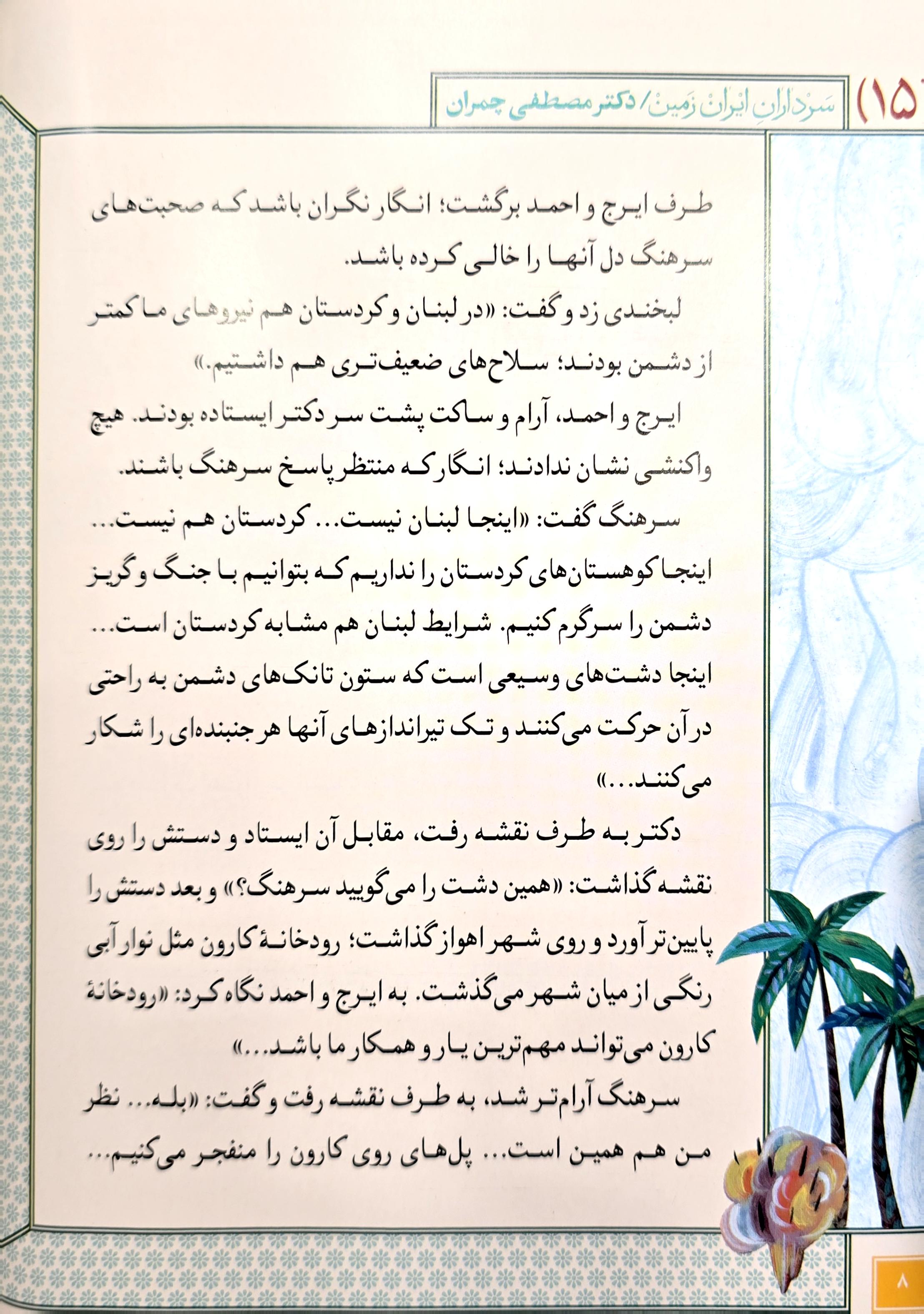 دکتر به طرف نقشه رفت مقابل آن ایستاد و دستش را روی نقشه گذاشت: «همین دشت را میگویید سرهنگ؟» و بعد دستش را پایینتر آورد و روی شهر اهواز گذاشت؛ رودخانه کارون مثل نوار آبی رنگی از میان شهر میگذشت. به ایرج و احمد نگاه کرد: «رودخانه کارون میتواند مهمترین یار و همکار ما باشد...