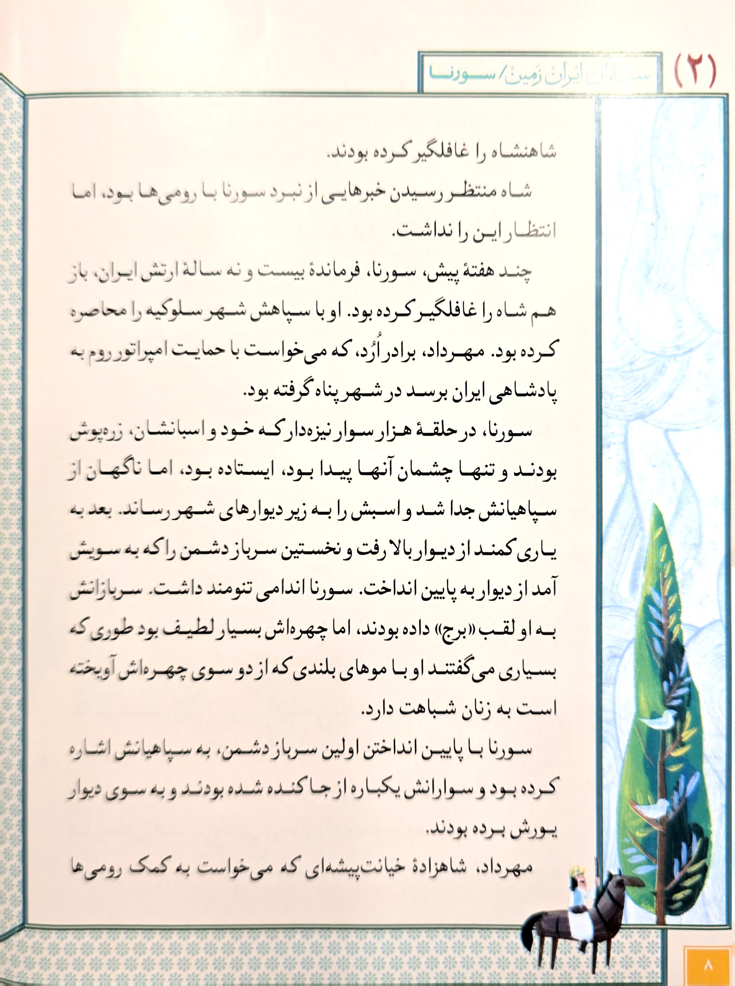 مهدی میرکیایی که پیش از این با مجموعه سرگذشت استعمار روزگار خوشی را، ولو به قدر ورق زدن چند صفحه، برای کتابرسانیها ساخته بود در این مجموعه تیر خلاصی را به قلب نوجوانان کتابخوان و کتابنخوان شلیک کردهاست. جلد دوم این مجموعه مخاطب را به دوران باستان میبرد تا از جنگ روم و ایران بگوید و سپهسالاری دلیری اشکانی به نام سورنا را تصویر کند.