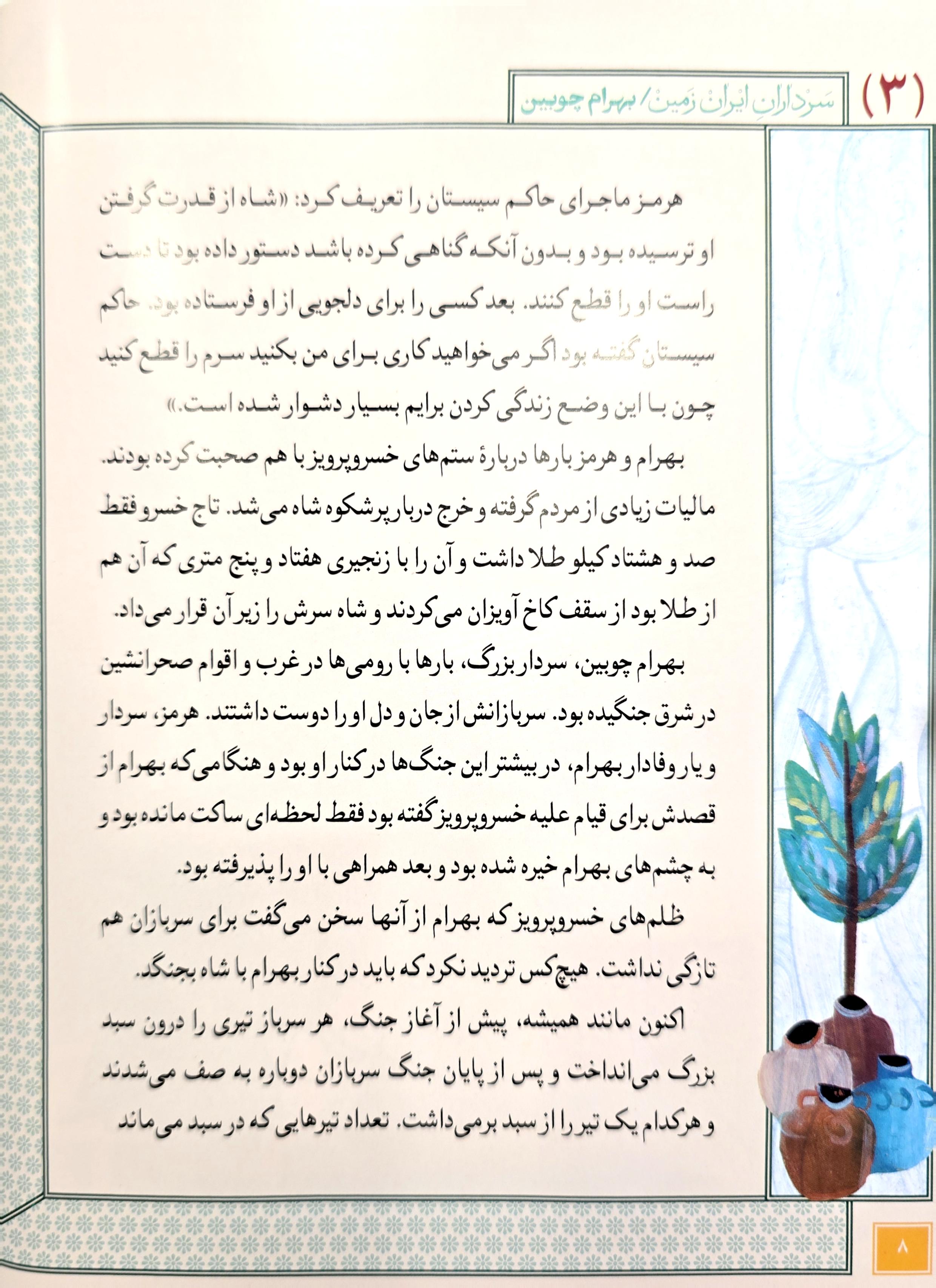 مجموعه سرداران ایران زمین به قلم خواندنی مهدی میرکیایی و تصویرگری سید حسام طباطبایی مجموعهای خواندنی است که زندگی سرداران بزرگ ایرانی را در دوران باستان، مشروطه، انقلاب، جنگ تحمیلی و ... روایت میکند. جلد سوم این مجموعه زندگینامه یک نجیبزاده، سپهبد ارتش و رهبر سیاسی اواخر امپراتوری ساسانی، به نام بهرام چوبین را روایت میکند.