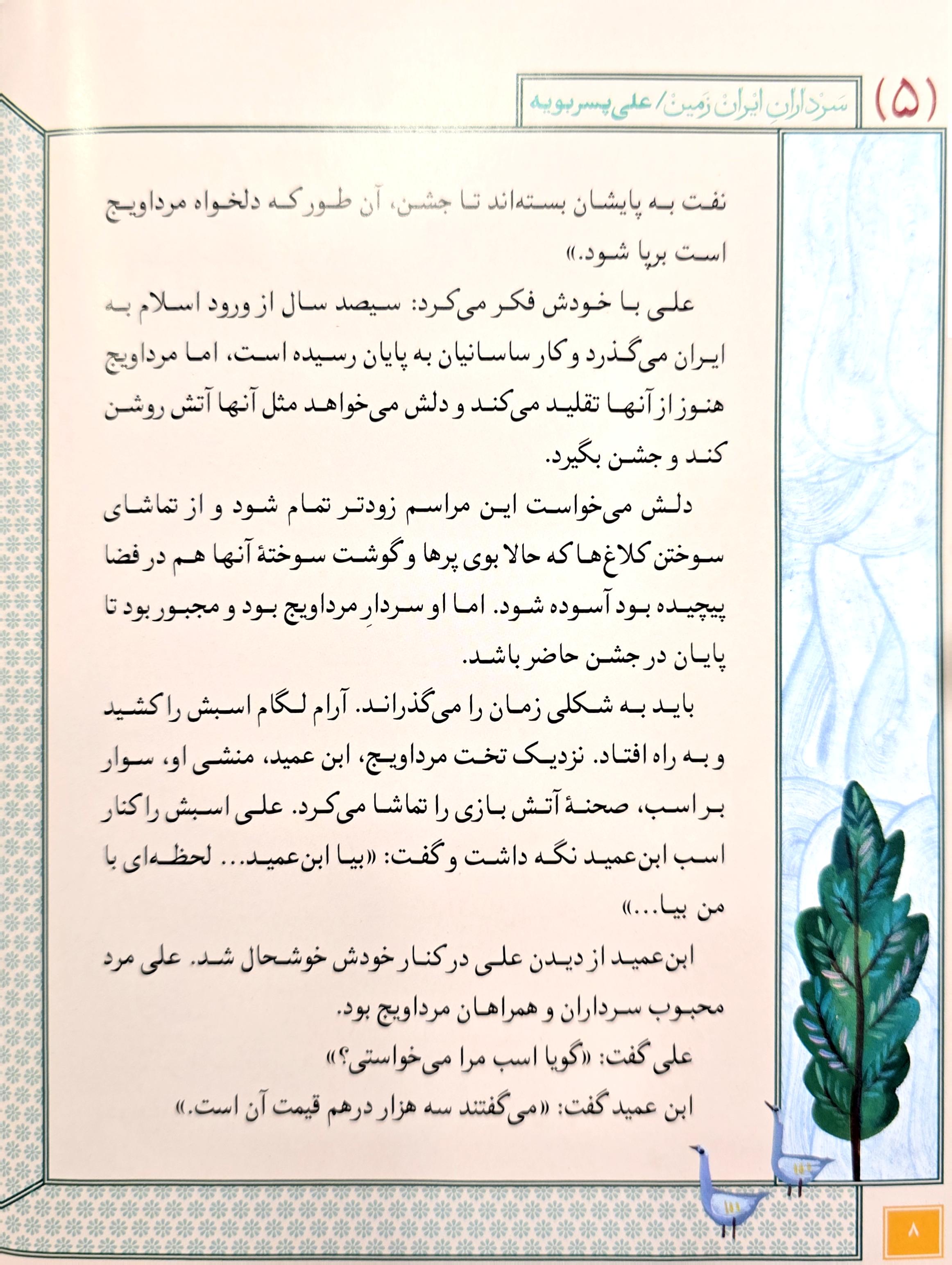 مجموعه سرداران ایران زمین به قلم خواندنی مهدی میرکیایی و تصویرگری سید حسام طباطبایی مجموعهای خواندنی است که زندگی سرداران بزرگ ایرانی را در دوران باستان، مشروطه، انقلاب، جنگ تحمیلی و ... روایت میکند. جلد پنجم این مجموعه زندگی علی دیلمی ملقب به عمادالدوله و فرزند بویه، پایهگذار سلسلهٔ آل حسنی (بوییان) در فارس بود که با شکست حکومت عباسی توانست فضای فرهنگی و سیاسی شیعیان را بهبود بخشد. در دوران حکمت او دانشمندانی نظیر شیخ مفید و شریف رضی مجال رشد و کتابت یافتند.