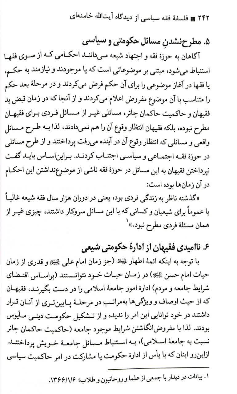 « یک عیب در حرکت فقاهت ما از اولین روزها تقریباً تا چند سال قبل وجود داشته ..... این بود که آن روزی که فقیه مشغول استنباط احکام اسلامی بود. برای ساختن یک جامعه برای اداره یک عده مردم یک کشور برای پاسخگویی به نیازهای معمولی و روزمره یک مجتمع عظیم درس نمیخواندند. علت هم این بود که اجتماعات آن روز و کشورها و جوامع و حکومتها و رژیمها هرگز از فقه اسلام سؤال نمیکردند تا فقها بخواهند جواب آنها را به صورت یک نیاز و یک ضرورت بگردند و در مبادی فقهی پیدا کنند. پاسخ به سوالاتی بود که برای زندگی مؤمنانه یک انسان لازم است.»