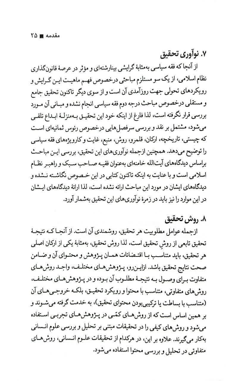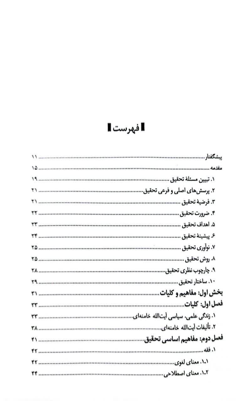 بخش دوم کتاب ماهیت، تاریخچه، قلمرو، منابع، غایت و کارویژههای فقه سیاسی و روششناسی فقه سیاسی را مورد مطالعه قرار داده است. آنچه در این بخش خودنمایی میکند توجه به این مسئله است که در فقه سیاسی مانند اصل فقه از منابعی چون کتاب، سنت، اجماع و عقل بهره گرفته میشود. لکن استفاده از این منابع در فقه سیاسی اقتضائات و اختصاصات متفاوتی دارد؛ بلکه اولیت و اولویت استفاده از هر کدام از این منابع موجب رویکرد متمایز استنباطی خواهد شد.