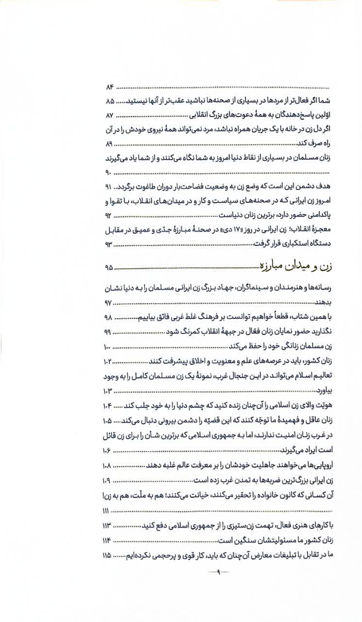 بخش دوم این کتاب که به همت مهدی تکلو گردآوری شده است، مجموعهای از سخنان رهبر معظم انقلاب درباره درخشش زن مسلمان ایرانی است. این بخش از نقش استثنائی زن، لطافت و برندگی زنها، عقلانیت سیاسی زن، زنان الگو، خانواده و زن، نابودی بتگرایی مرد در قرآن، عظمت مادر و نقش او در تعالی خانواده و جامعه میگوید. بر این مبنا زن ایرانی در ایران اسلامی باید کوششش این باشد که هویت والای زن اسلامی را آنچنان زنده کند که جشم دنیا را به خود جلب کند. زن مسلمان باید الگوی زن را نشان بدهد تا به جهانیان اثبات کند، زن مسلمان زنی است که هم در میدان معنویت و علم و تحقیق و تقرب به سوی خدا پیشروی میکند و هم در میدان سیاسی حضور دارد. کتاب حاضر با اتکا به بیانات رهبر انقلاب نقش نوینی در حوزه اجتماع، سیاست و تمدن بر عهده زن مسلمان مینهد و او را سرآغاز نظم نوین جهانی میداند.